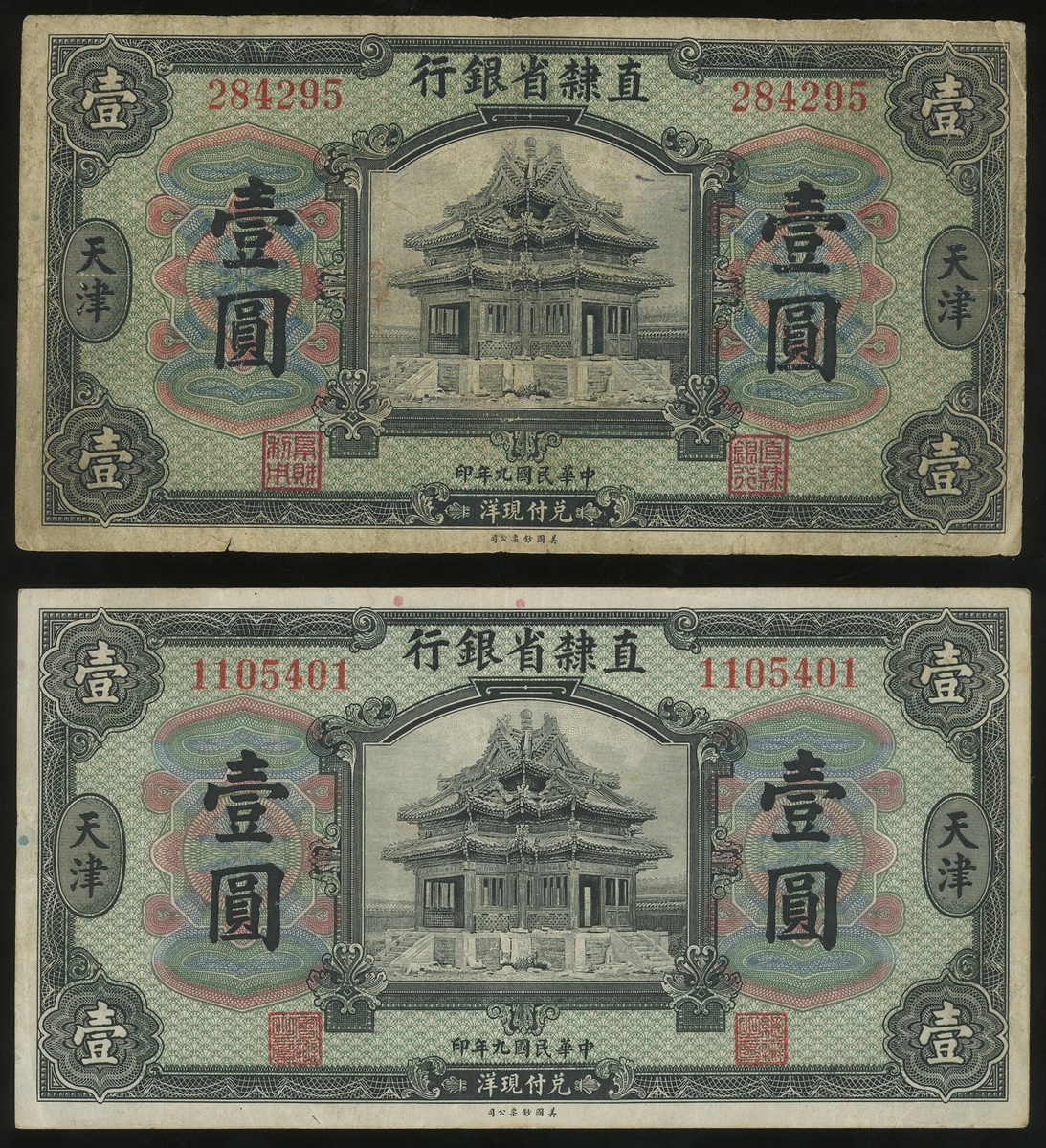 民國九年(1920)直隸省銀行壹圓一對,編號284295及1105401,F-VF品相