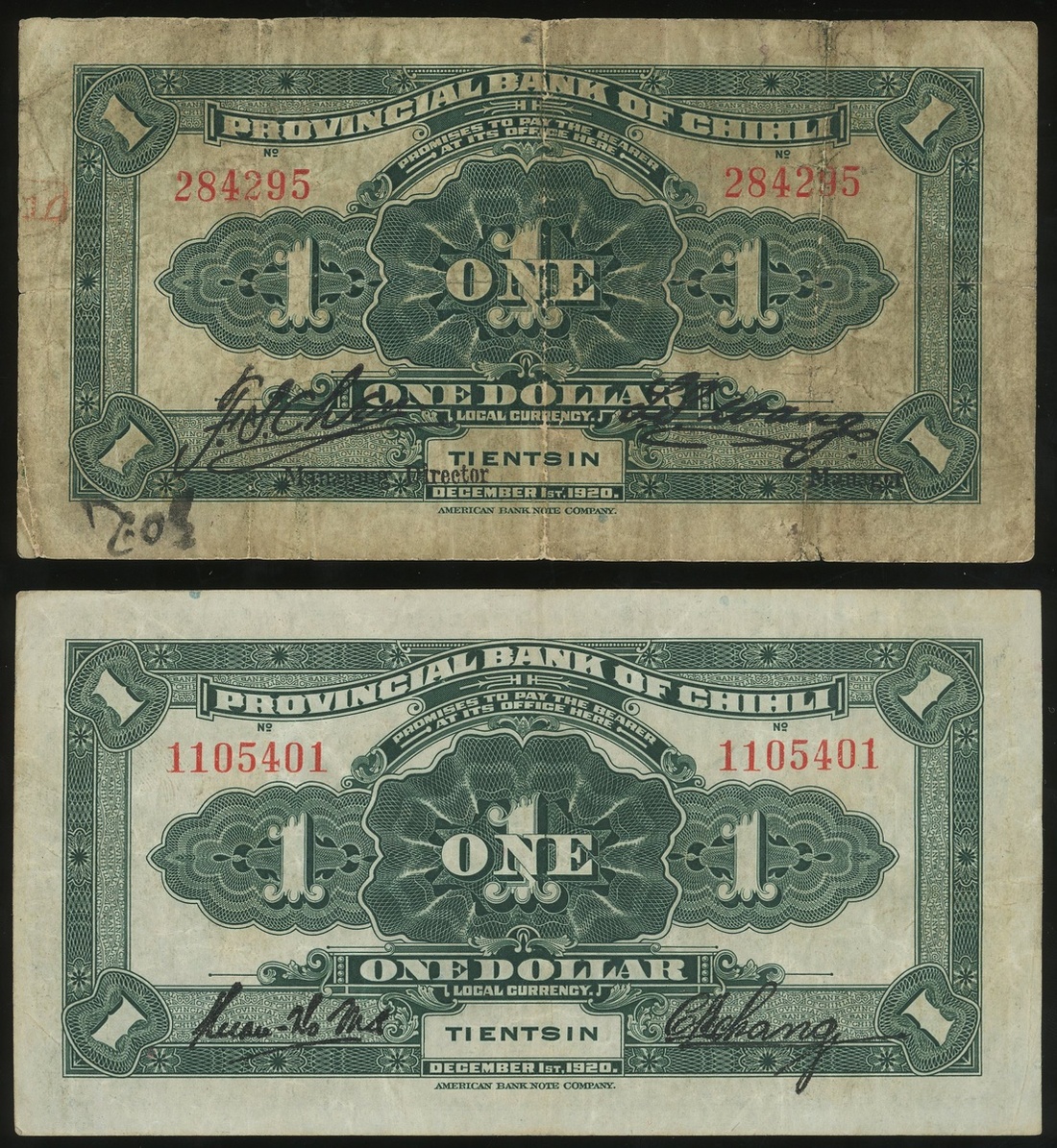 Provincial Bank of Chihli, lot of 2x $1, 1920, serial numbers 284295 and 1105401, each note with different red seal signatures,