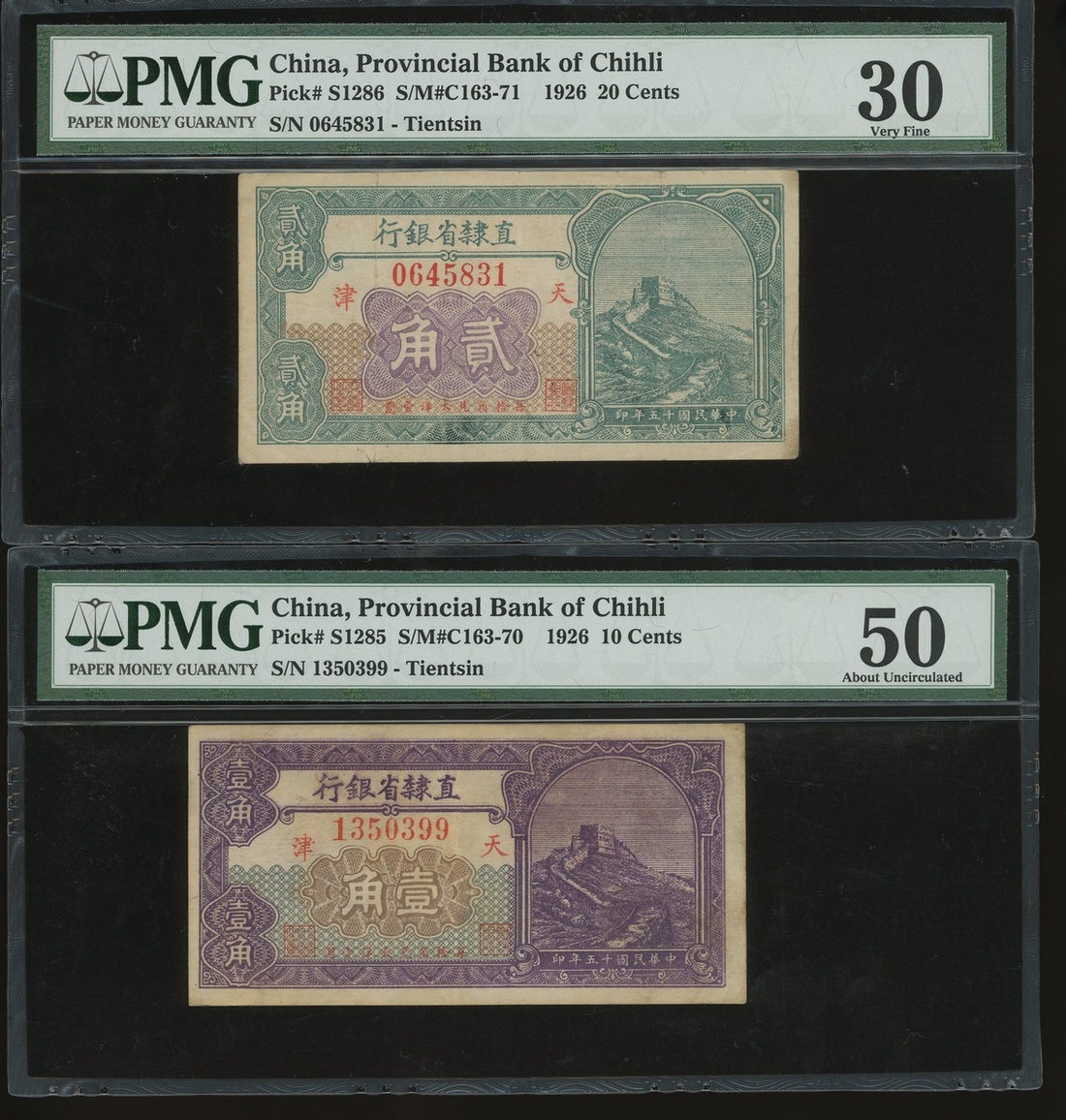 Provincial Bank of Chihli, a group of 3x notes, 100 coppers, Yungtsun, Year 14(1925), 10 cents and 20 cents, Tientsin, Year 15(1926), serial numbers 0638083, 1350399 and 0645831, (Pick S1278a, S1285 and S1286), graded PMG 20NET (Repaired), 50 and 30 respectively (3).