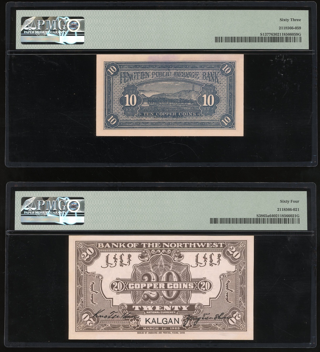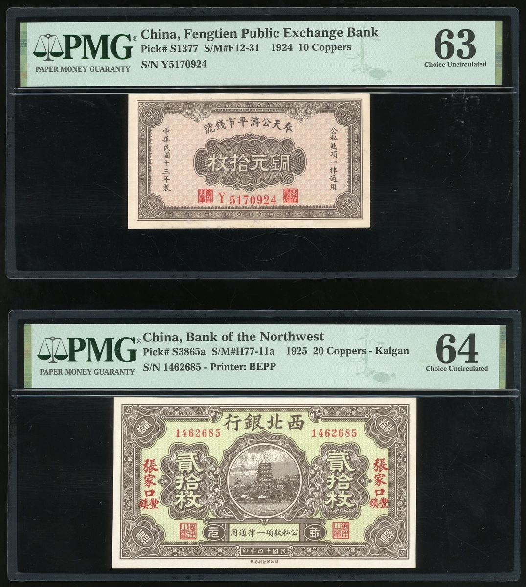Fengtien Public Exchange Bank and Bank of the Northwest, 10 coppers, Year 13 (1924) and 20 coppers, Kalgan, Year 14 (1925), serial numbers Y5170924 and 1462685 respectively, (Pick S1377, S3865a), graded PMG 63 and 64 respectively (2)
