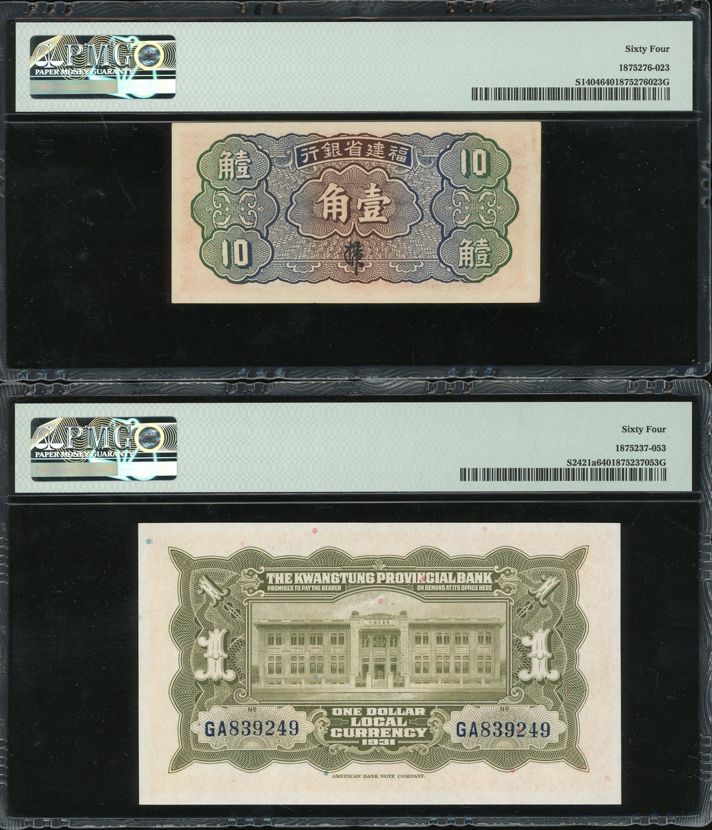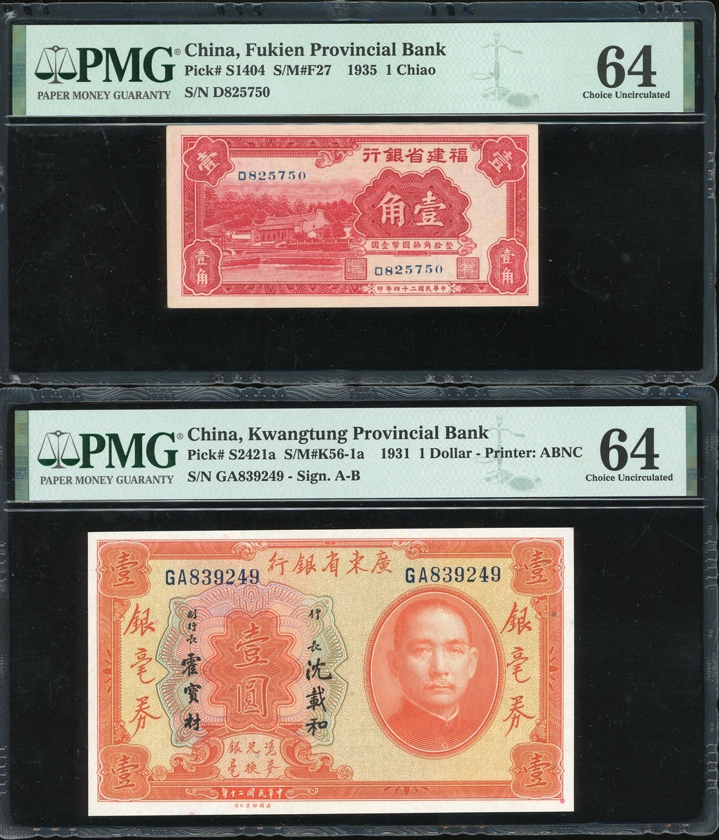 民國二十四年(1935)福建省銀行壹角及民國二十年廣東省銀行壹圓,編號D825750及GA839249,均PMG 64