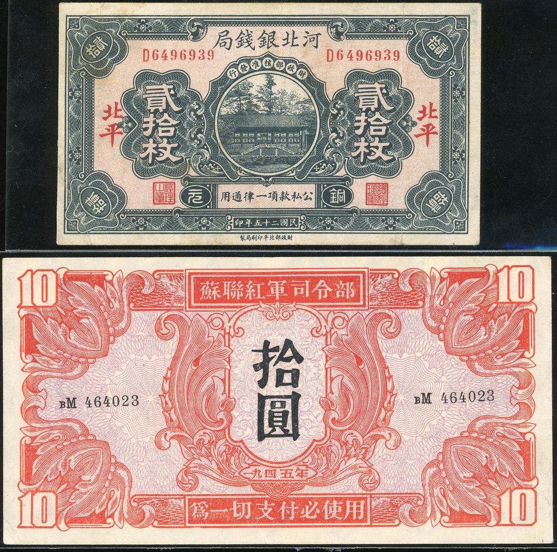 China, a pair of notes, 10 yuan, Soviet Red Army Headquarters, 1945, and copper 20 coins, Ho Pei Metropolitan Bank, Peking, Year 25(1936), serial numbers BM464023 and D6496939, (Pick M35 and S1709), very fine to good very fine (2).