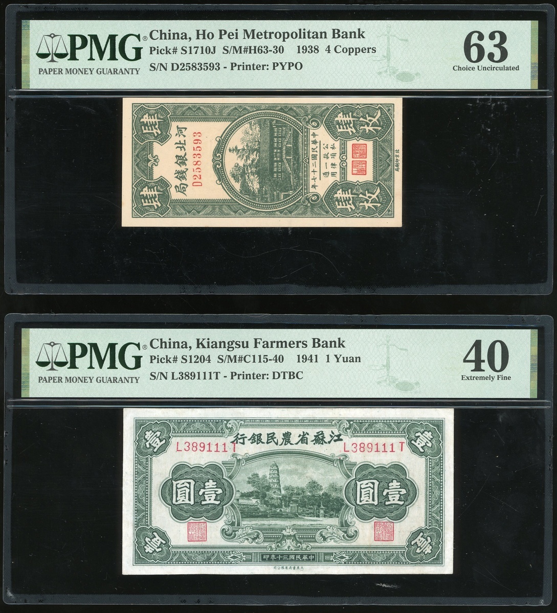 Republic of China: Provincial Banknotes, group of 3 consisting of: Ho Pei Metropolitan Bank, 4 coppers, Year 27 (1938); Kiangsu Farmers Bank, 1 yuan, 1941; Provincial Bank of Kweichow, 1 cent, 1949; serial numbers D2583593, L389111T, A330404,