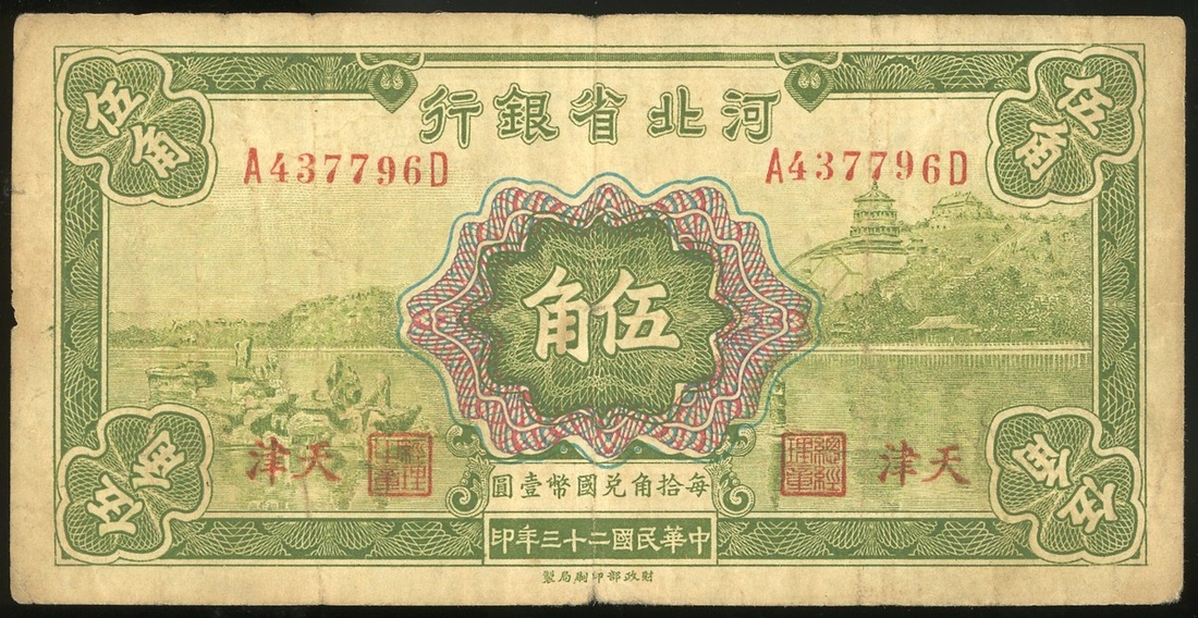 民國二十三年(1934)河北銀行伍角,天津地名,編號A437796D,about fine