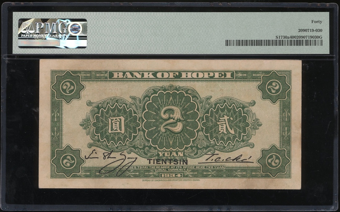 Bank of Hopei, 2 yuan, Tientsin, Year 23(1934), serial number C767845C, (Pick S1730a), PMG 40 Extremely Fine.