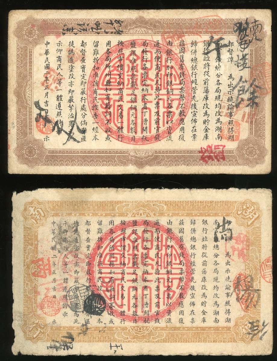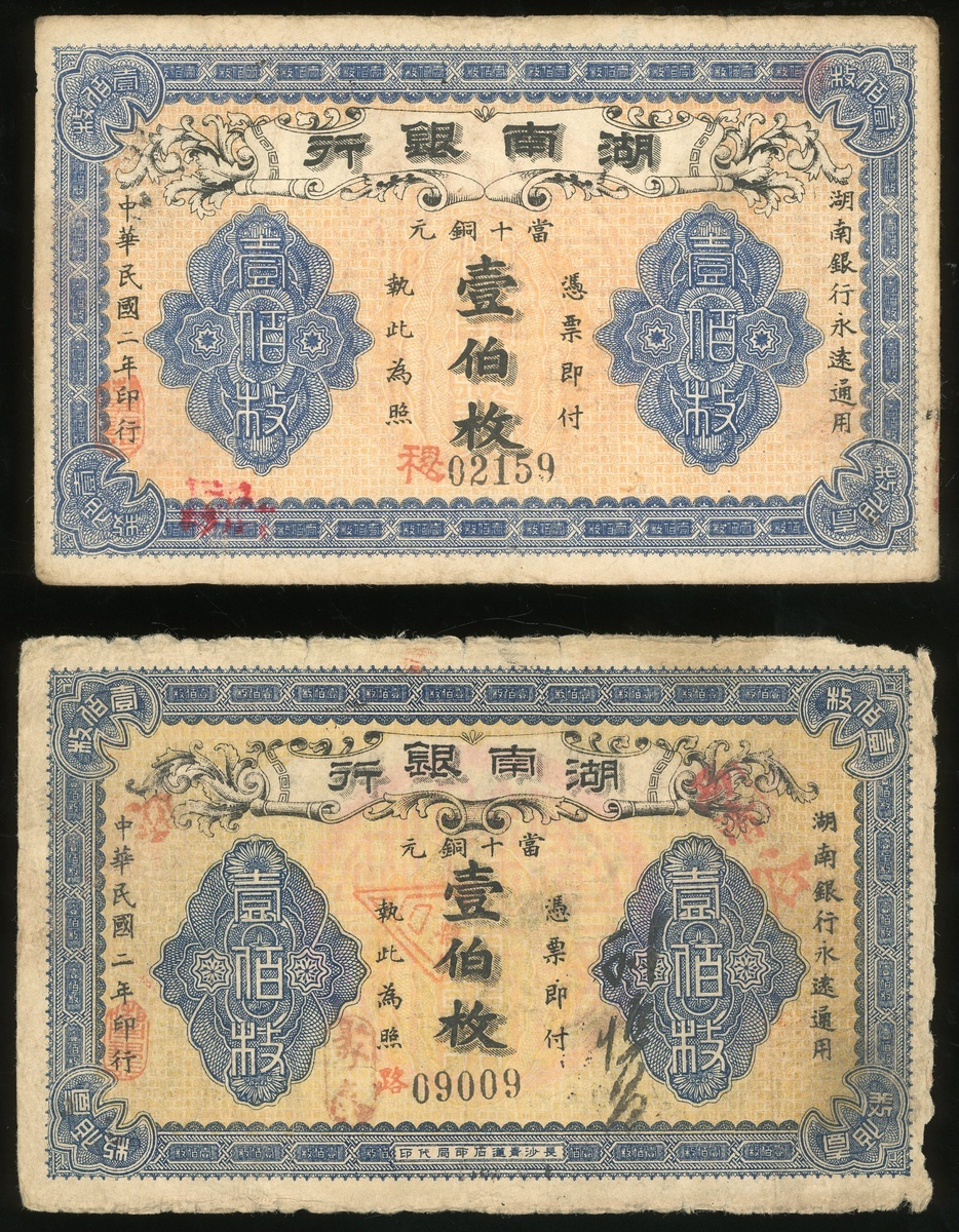 Hunan Bank, a pair of 100 coppers, Year 2(1913), serial numers 02159 and 09009, (Pick S2041), good fine and very good with ragged edges respectively (2).