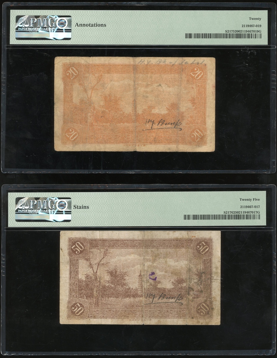 1921年熱河興業銀行貳拾枚,伍拾枚及壹佰枚,一組3枚,編號分別為1100730,0686409及,1460372,分別評PMG 20(有書寫),PMG 25(有漬),PMG 15(有色變)
