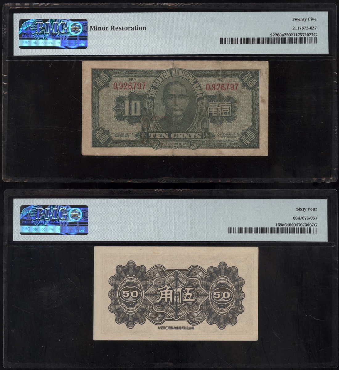 民國時期紙幣一組兩枚,民國二十年廣州市市立銀行壹毫,編號0926797及三十三年中國聯合準備銀行伍角,PMG 25-64