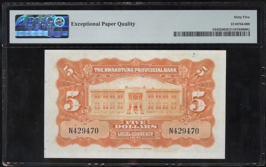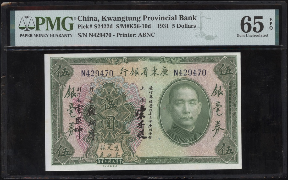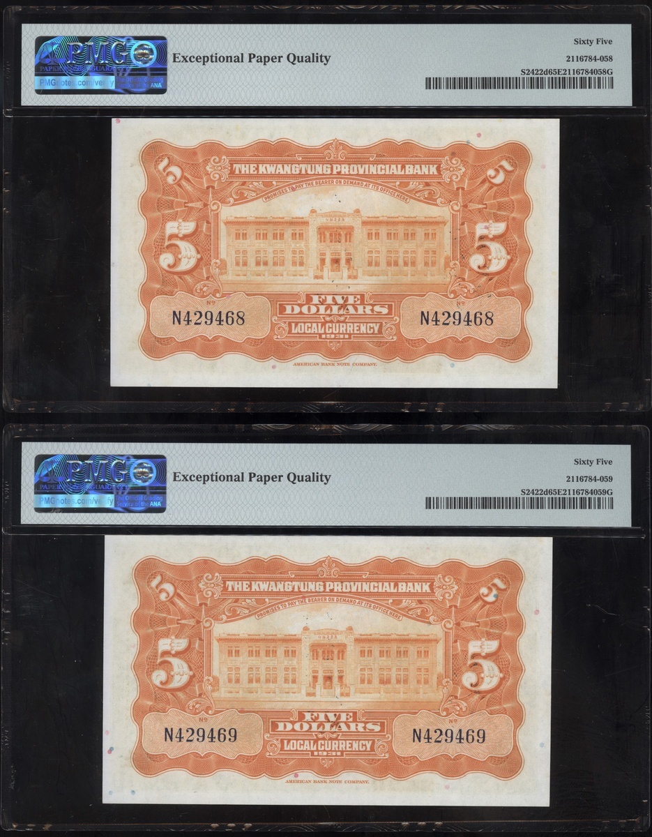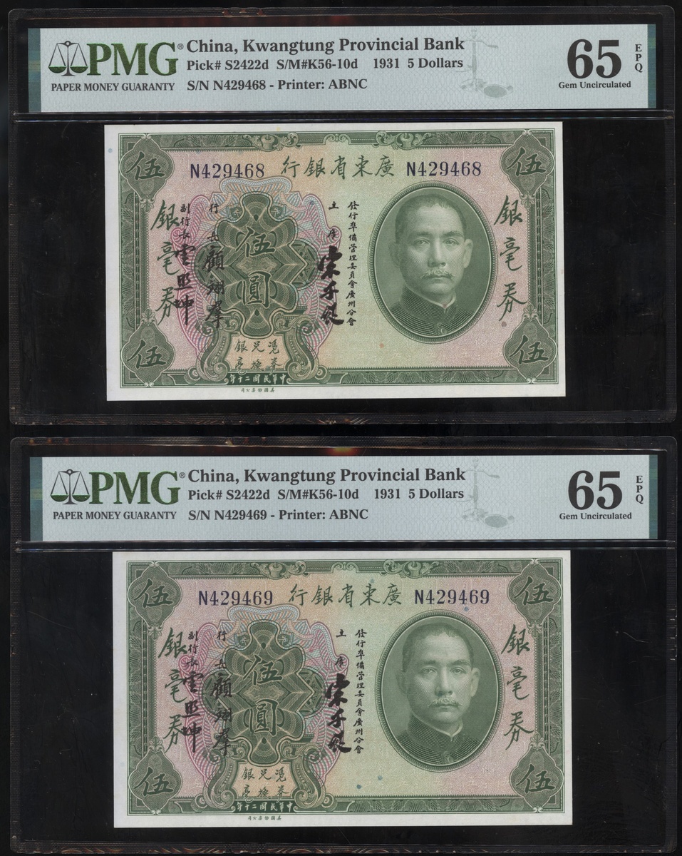 民國二十年廣東省銀行伍圓三枚連號,編號N429468至470,均PMG 65EPQ