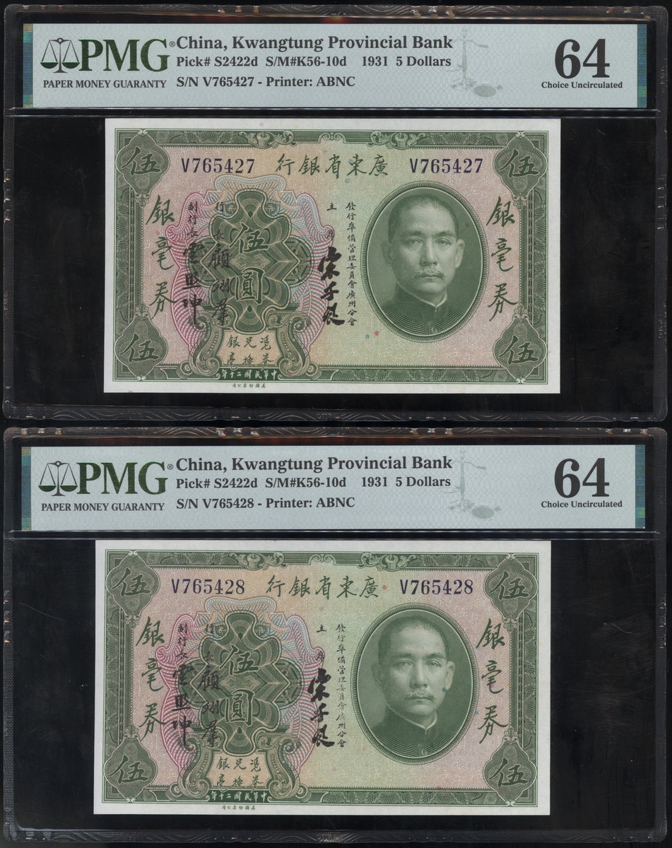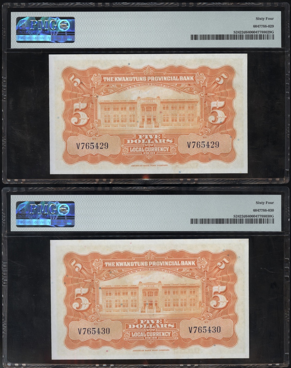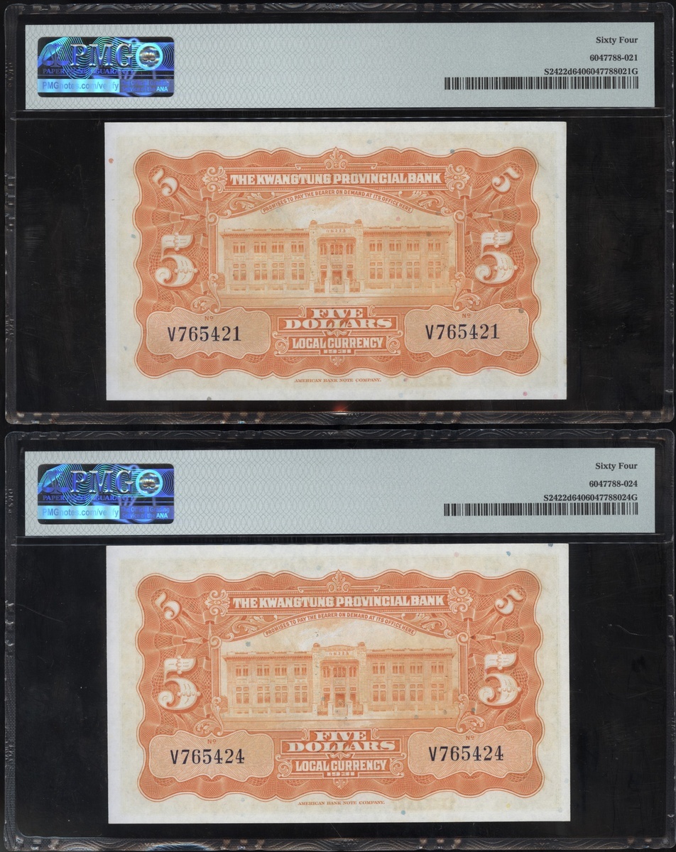 民國二十年廣東省銀行伍圓一組8枚,編號V765421及V765424-430,均PMG 64