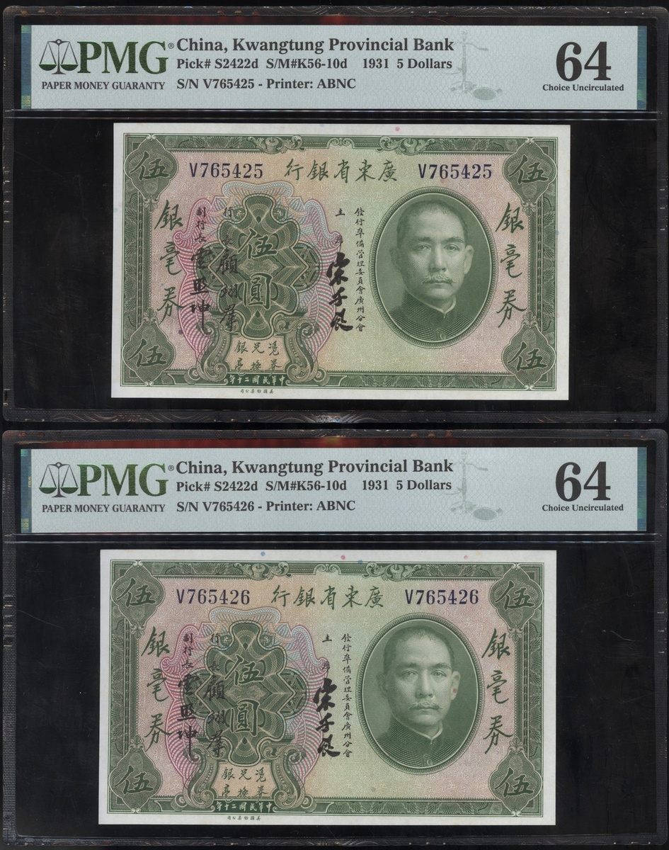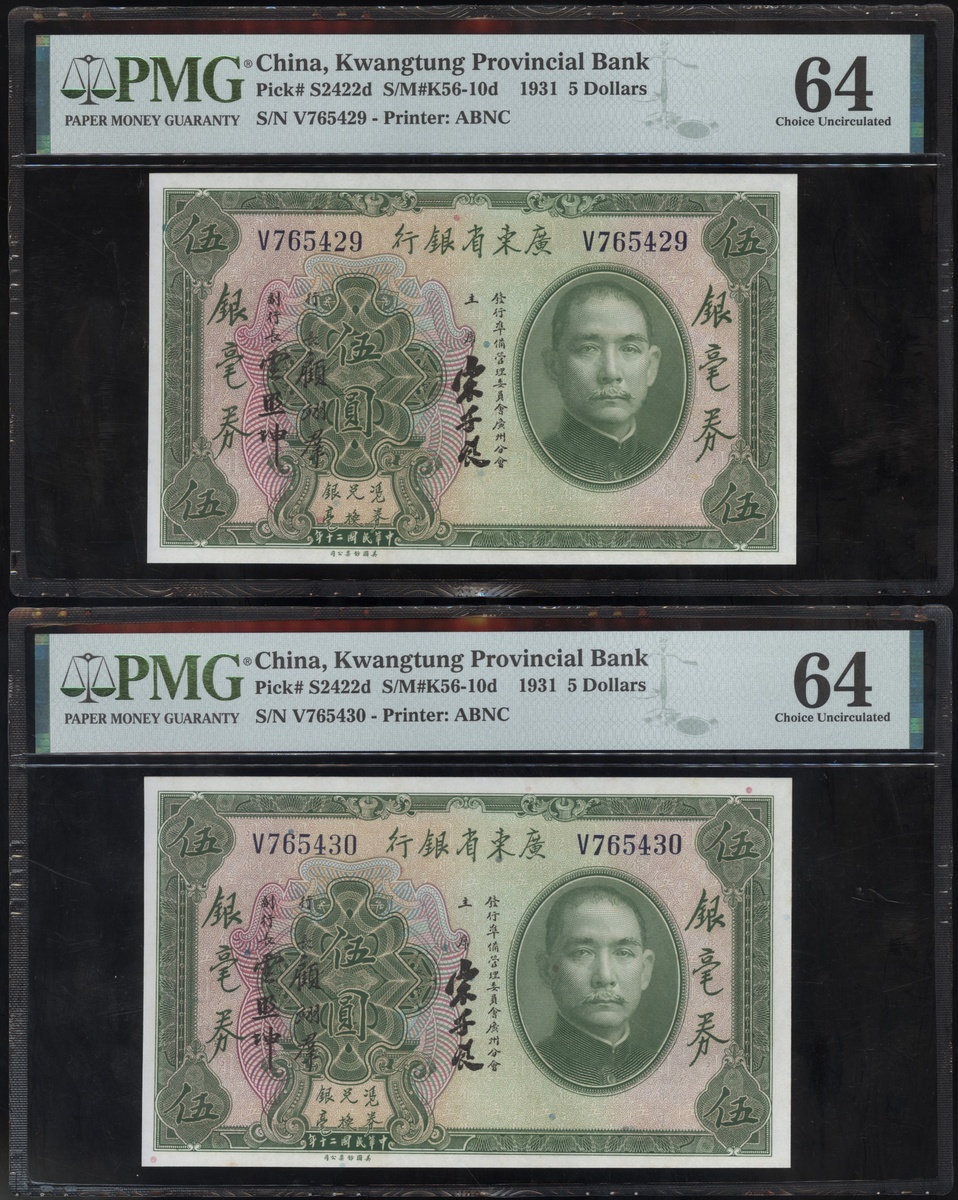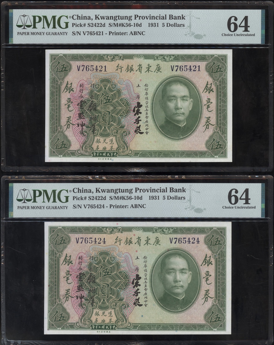 民國二十年廣東省銀行伍圓一組8枚,編號V765421及V765424-430,均PMG 64