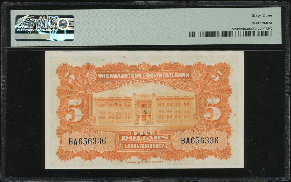 Kwangtung Provincial Bank, $5, 1931, serial number BA656336, (Pick S2422d), PMG 63 Choice Uncirculated