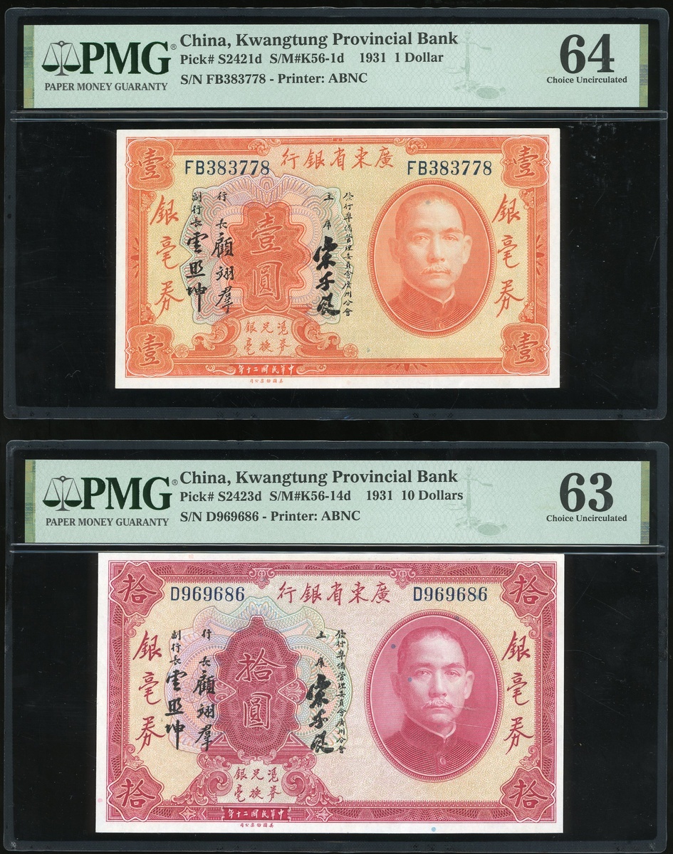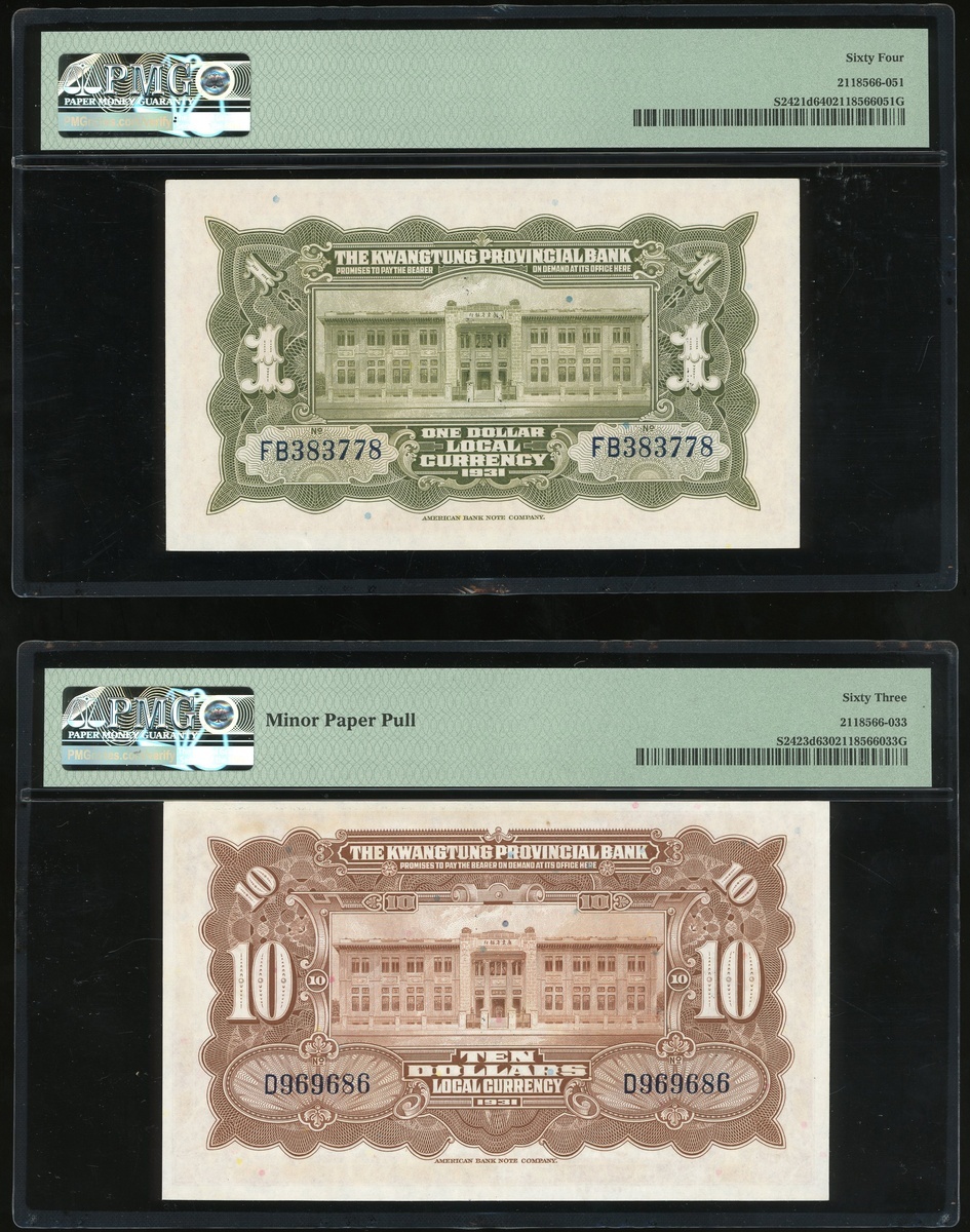 The Kwangtung Provincial Bank, $1 and $10, Year 20 (1931), serial numbers FB383778 and D969686, (Pick S2421d, S2423d), graded PMG 64 and 63 respectively (2)