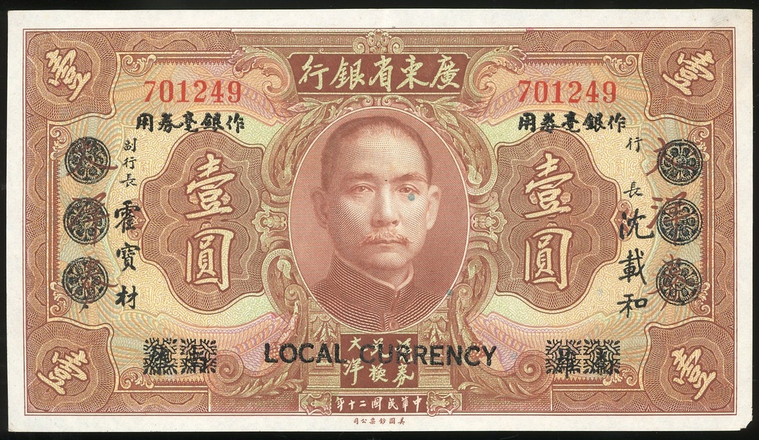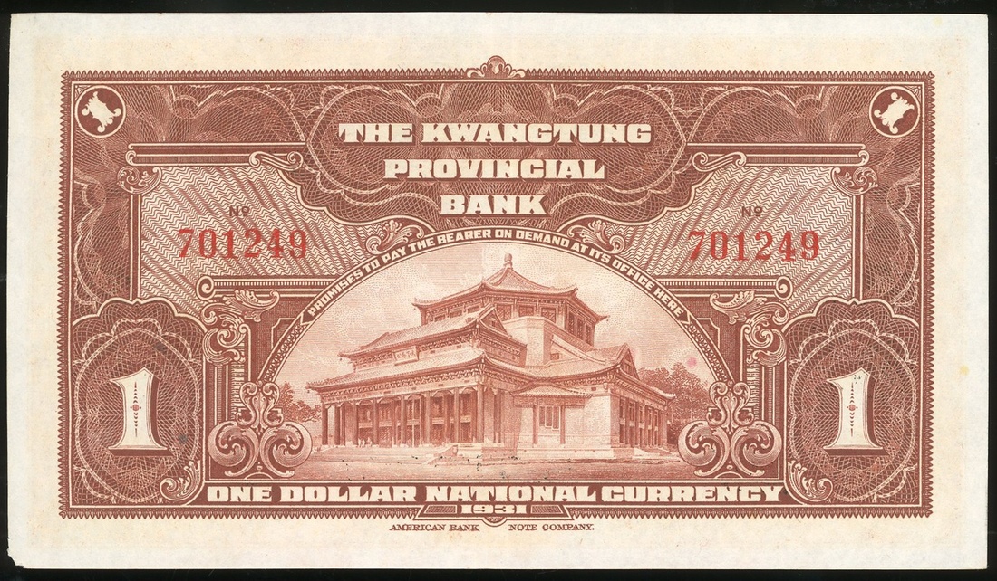 Kwangtung Provincial Bank, $1, "Nan Hsiung" blocked out at lower left and right on front, Year 20(1931), serial number 701249, (Pick S2425d), good extremely fine and scarce