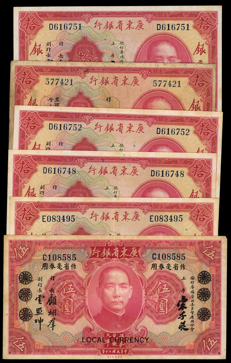 The Kwangtong Provincial Bank, a group of 6x notes, consists of 1x $5 local currency and 5x $10, Year 20(1931), serial numbers C108585, E083495, D616748, D616752, 577421 and D616751, (Pick S2426, S2423b and S242d), extremely fine, with toning (6).