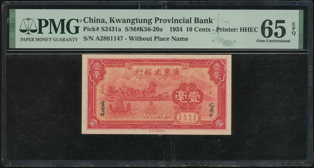 Provincial Bank of Kwangtung, 10 cents, 1934, serial number A2881147, (Pick S2431a), PMG 65EPQ Gem Uncirculated