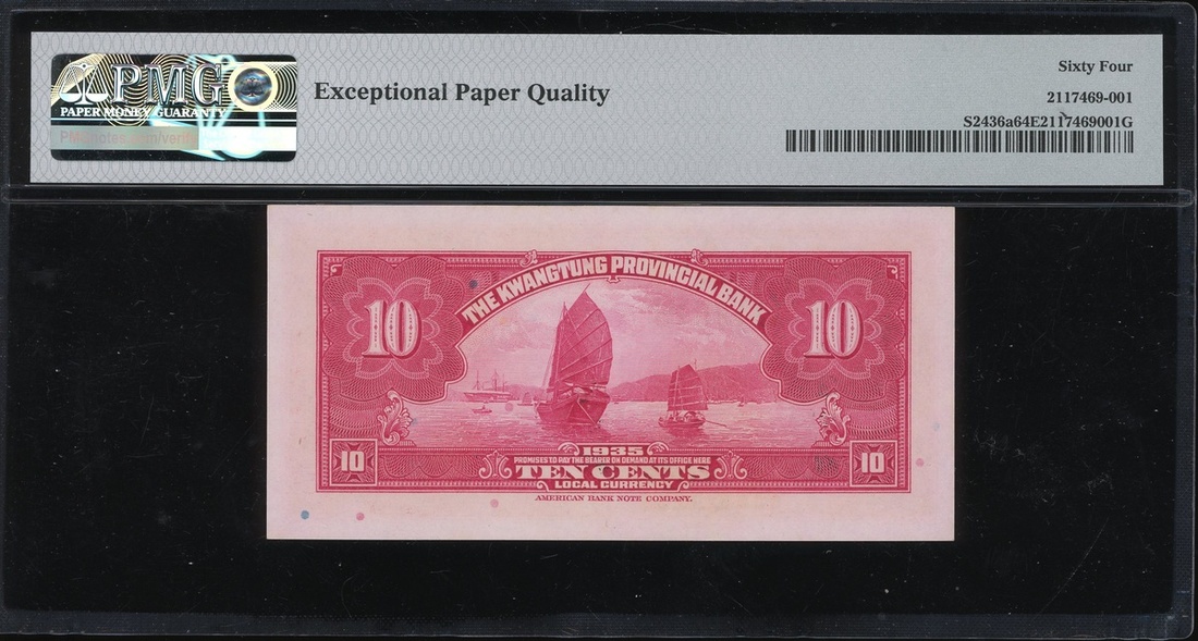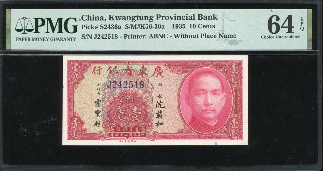 The Kwangtung Provincial Bank, 10 cents, Year 24 (1935), serial number J242518, (Pick S2436a), graded PMG 64EPQ Choice Uncirculated