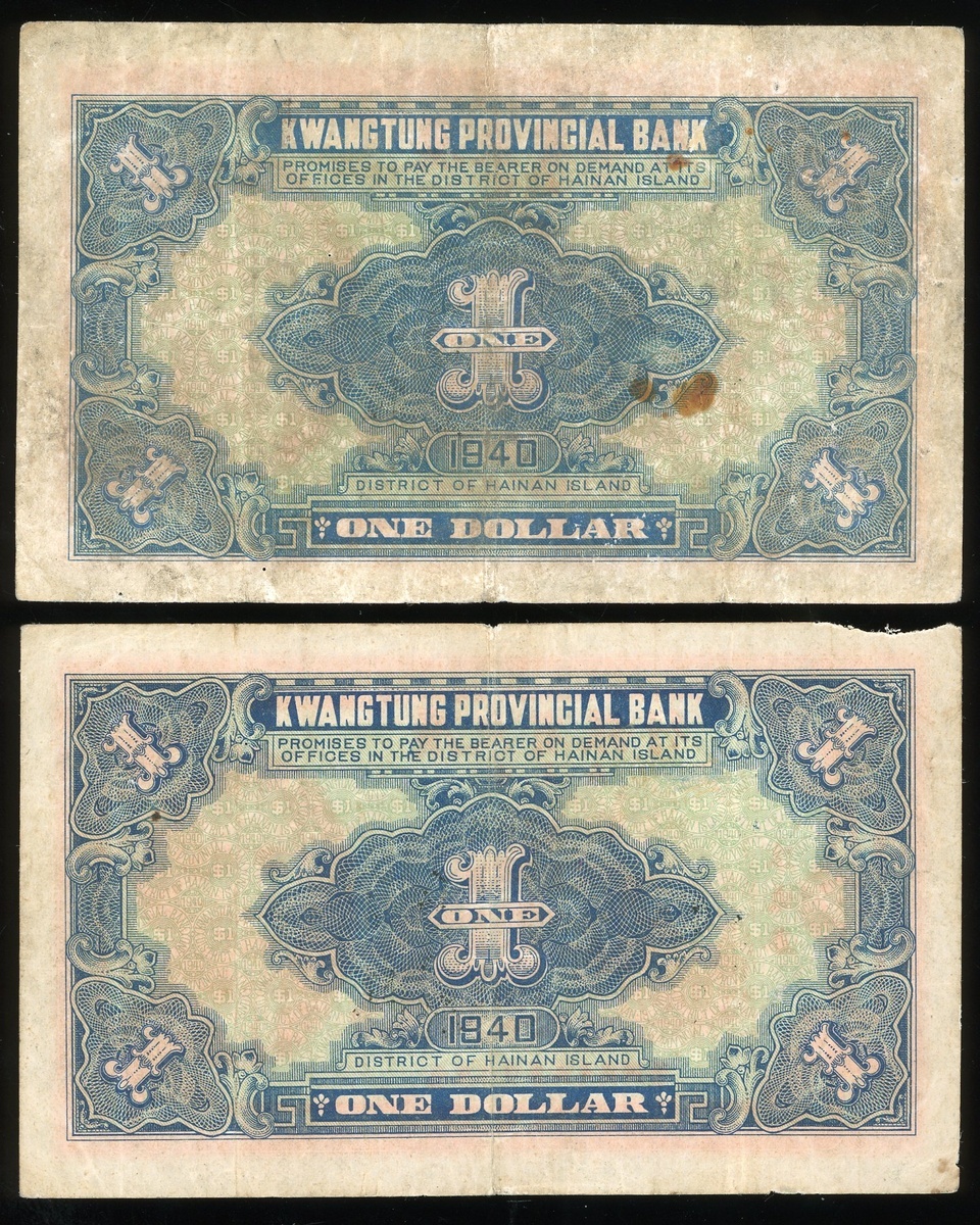Kwangtung Provincial Bank, a pair of: 1 yuan, issued note, Year 29 (1940), Hainan Island, serial numbers 2134160, 2096814, (Pick S2447), good fine to very fine, 2096814 with minor damage at upper left (2)