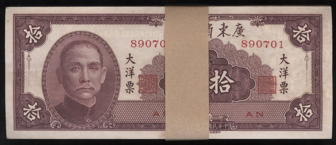 民國三十八年廣東省銀行十元100枚一組,連號890701-800,紙邊帶微黃,UNC