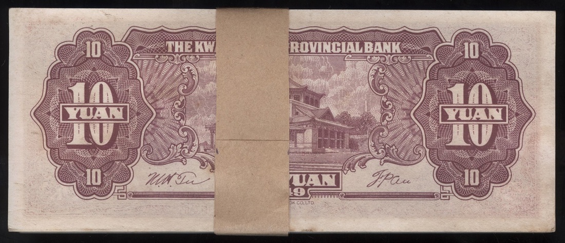 The Kwangtung Provincial Bank, a consecutive run of 100x 10 yuan, 1949, serial number 890701-800, (Pick S2458), foxing, minor edge stains, uncirculated.(100)