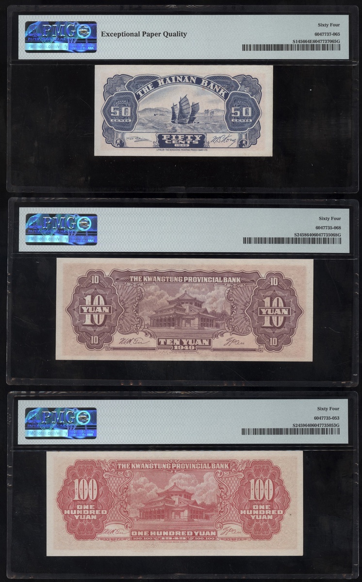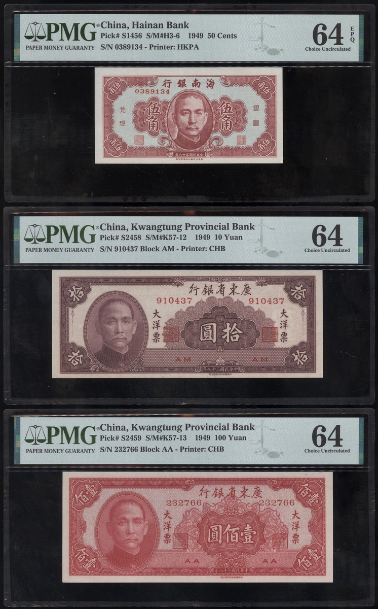 民國三十八年廣東省銀行拾、壹佰圓各一枚,編號910437及232766,另枚民國三十八年海南銀行伍角,編號0389134,均PMG 64-64EPQ
