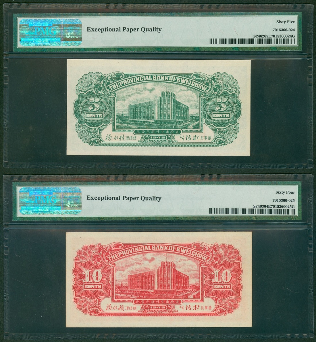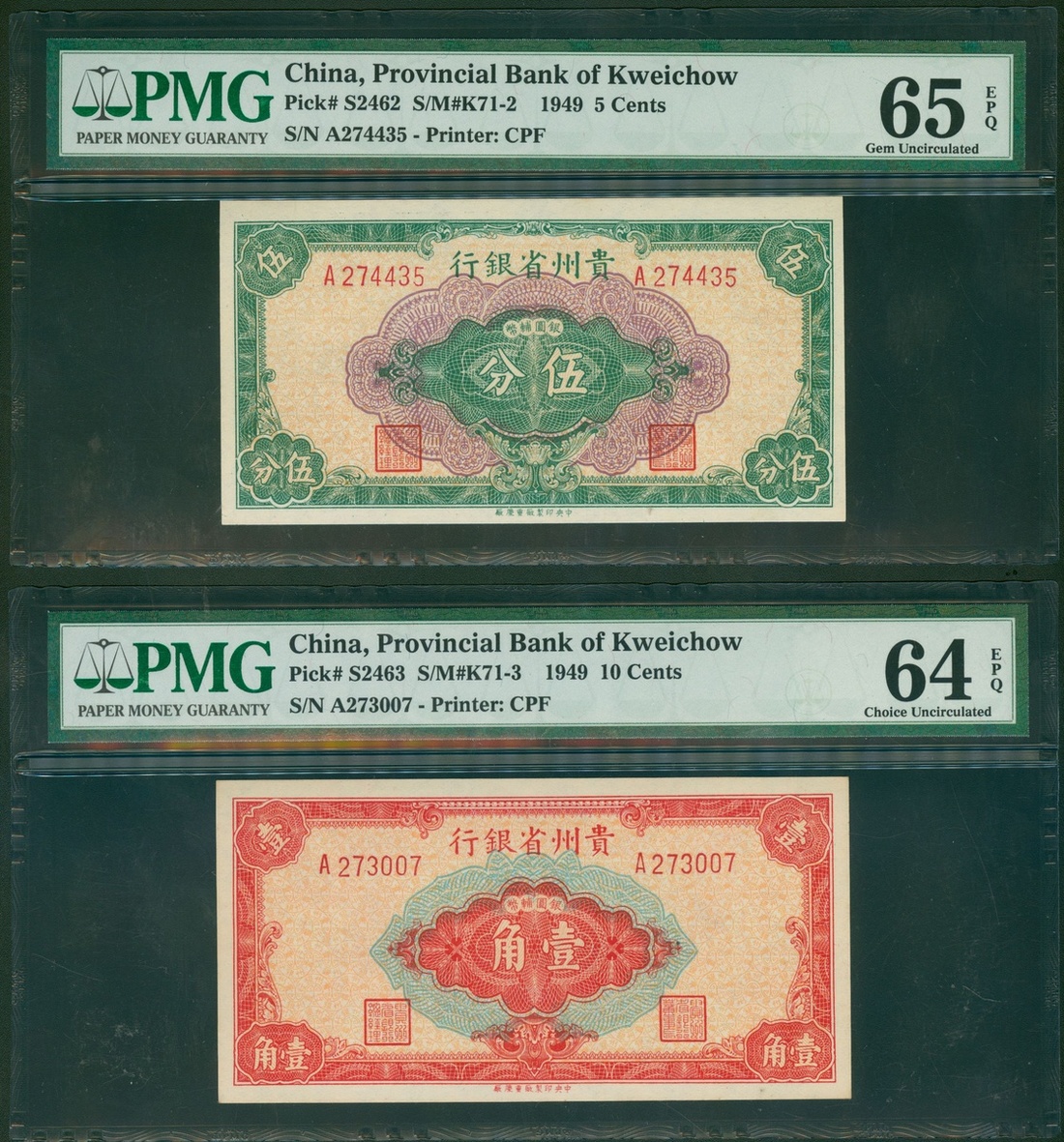 Provincial Bank of Kweichow, a pair of 5 cents and 10 cents, 1949, serial numbers A274435 and A273007, (Pick S2462 and S2463), graded PMG 65EPQ Gem Uncirculated and 64EPQ Choice Uncirculated (2).