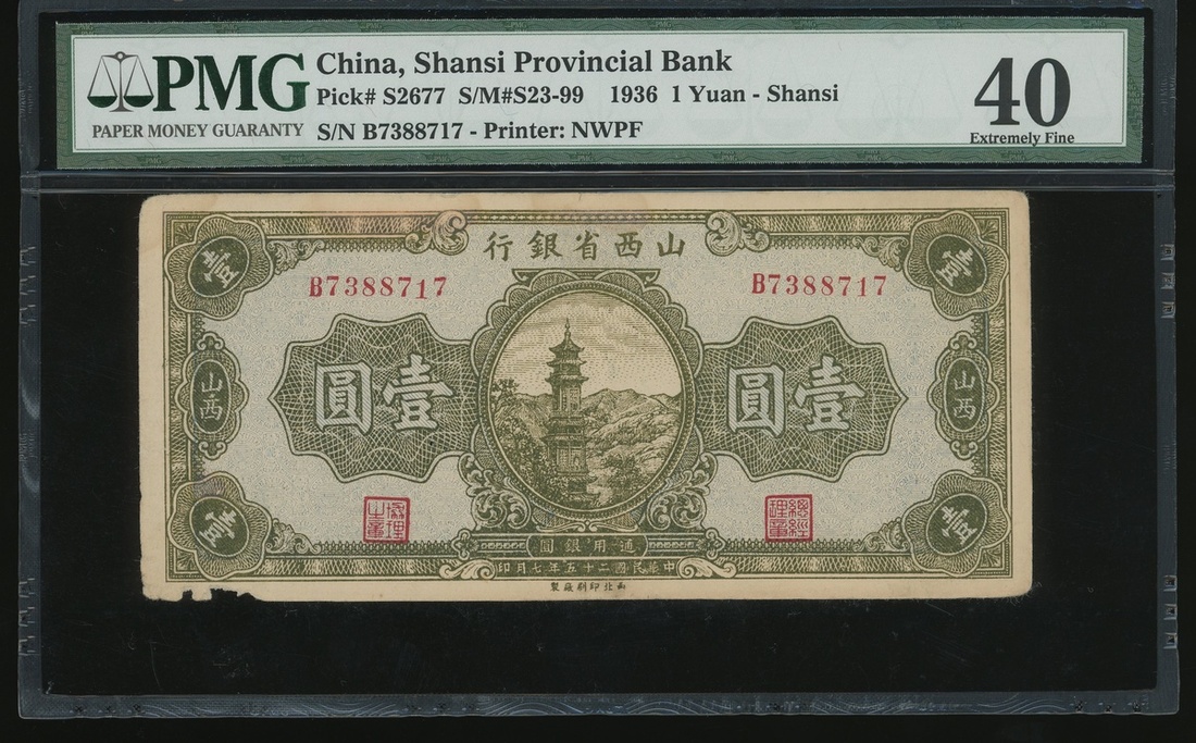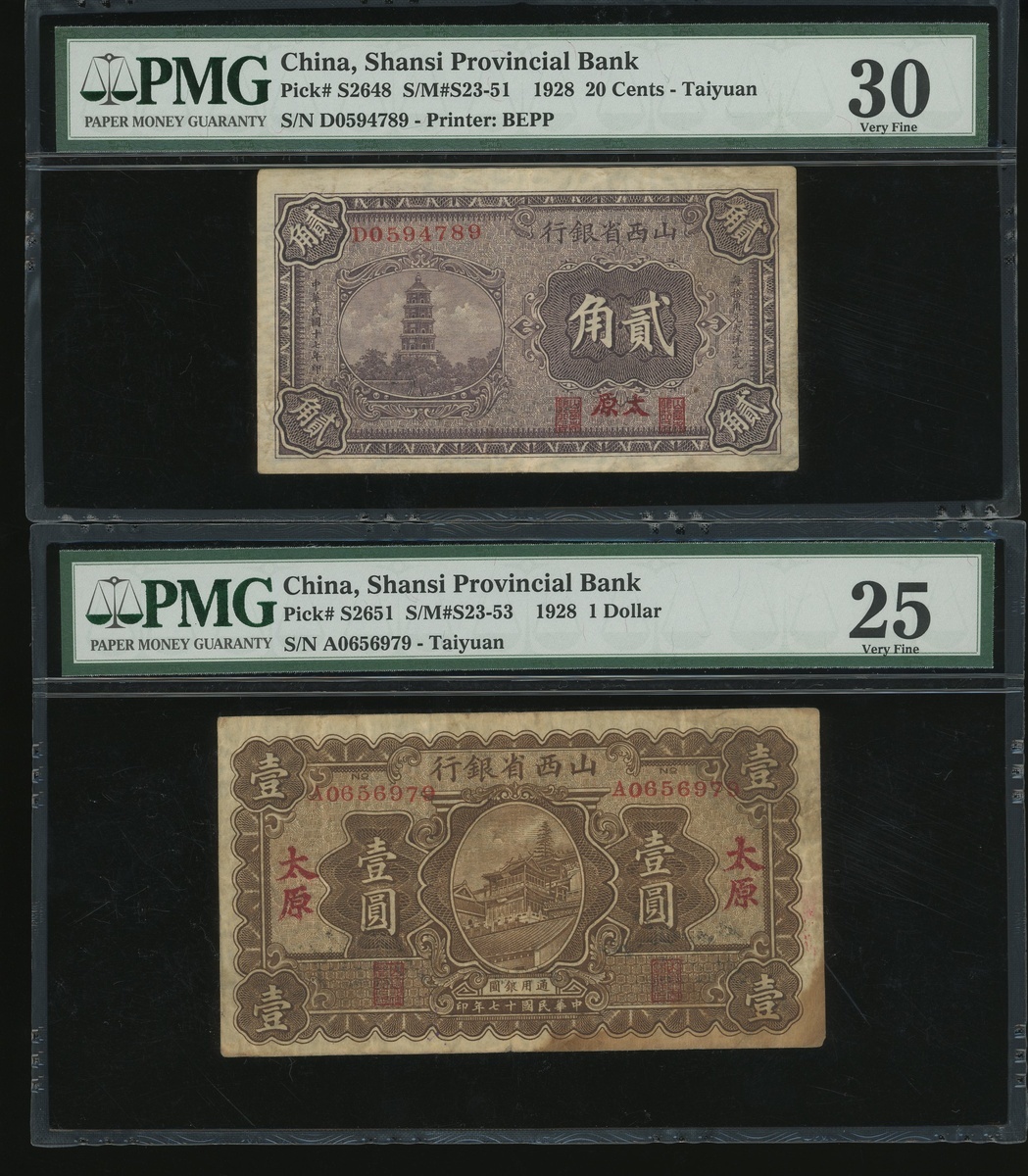 Shansi Provincial Bank, a group of 9 notes, consists of 10 coppers, 20 cents, $1(2), 1 yuan(4) and 10 yuan, various places, 1919-1936, (Pick S2633b, S2648, S2628a, S2651, S2657m, S2677 and S2673a), all in PMG holders, PMG 15 to 40 (9).