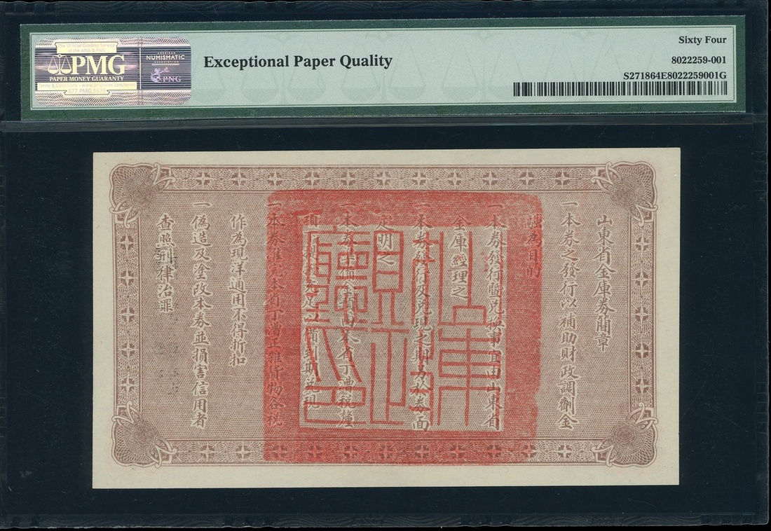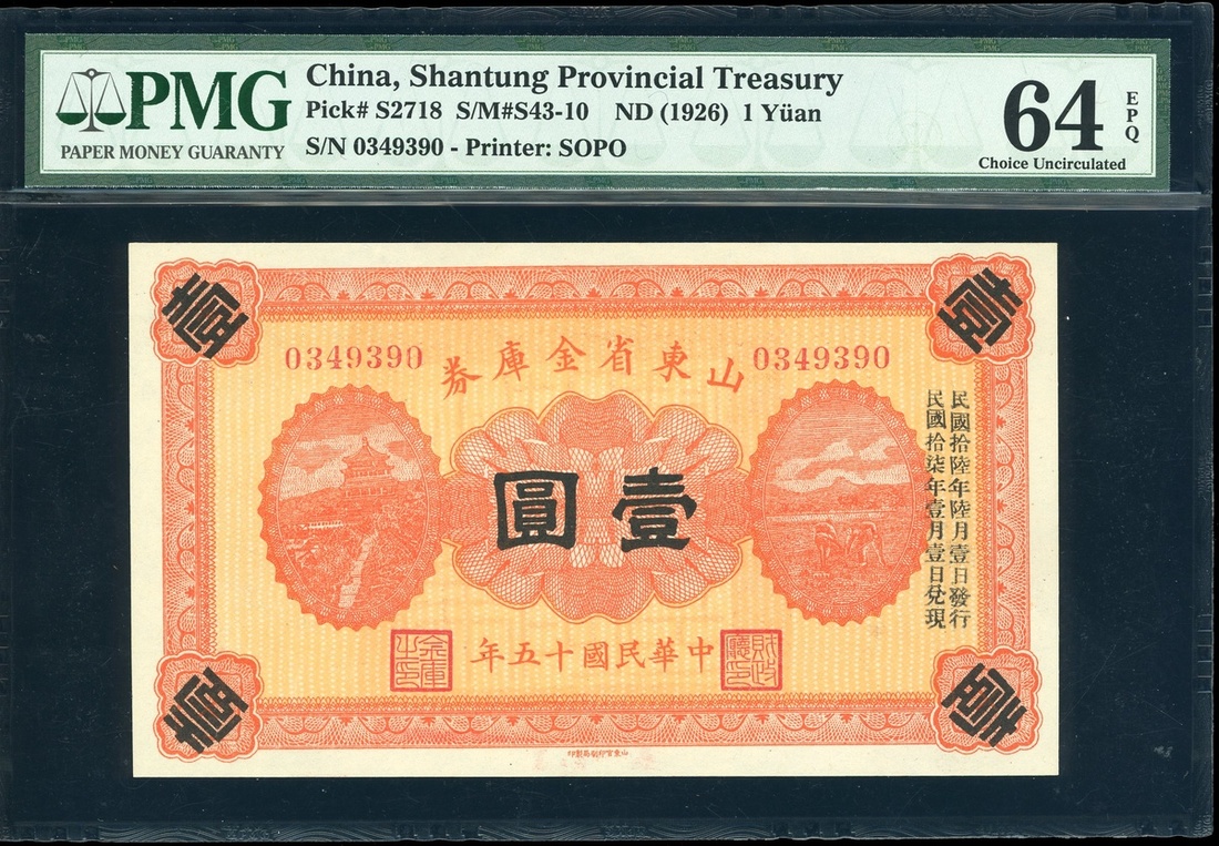 民國十五年(1926)山東省金庫券壹圓,編號0349390,PMG 64EPQ