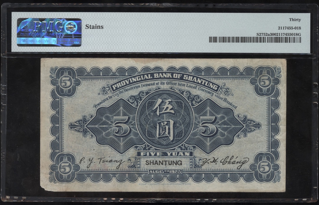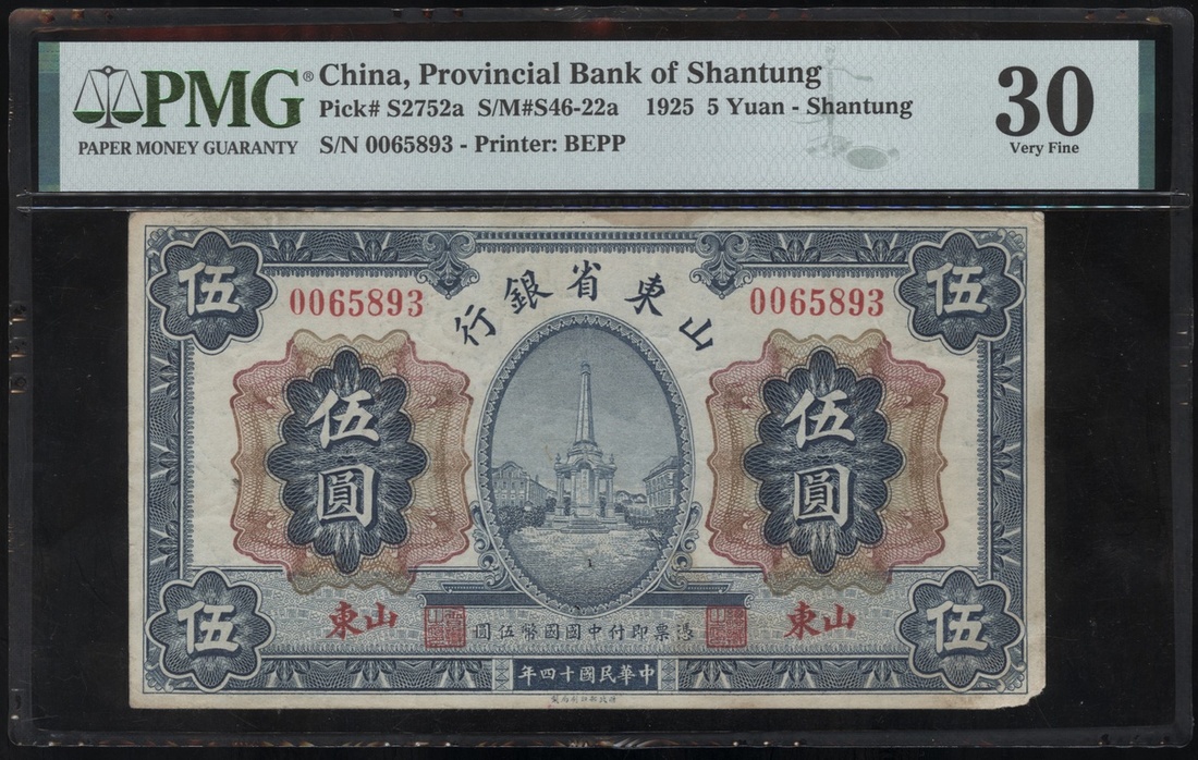 Provincial Bank of Shantung, 5 yuan, Year 14 (1925), serial number 0065893, (Pick S2752a), PMG 30 Very Fine