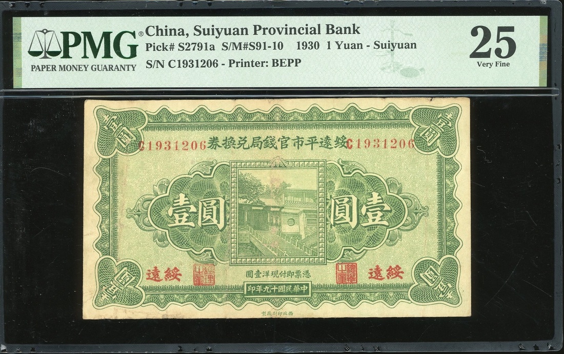 Suiyuan Provincial Bank, 1 yuan, Year 19 (1930), serial number C1931206, (Pick S2791a), PMG 25 Very Fine. Only 6 of such notes in the PMG population report with this being the second highest graded one!