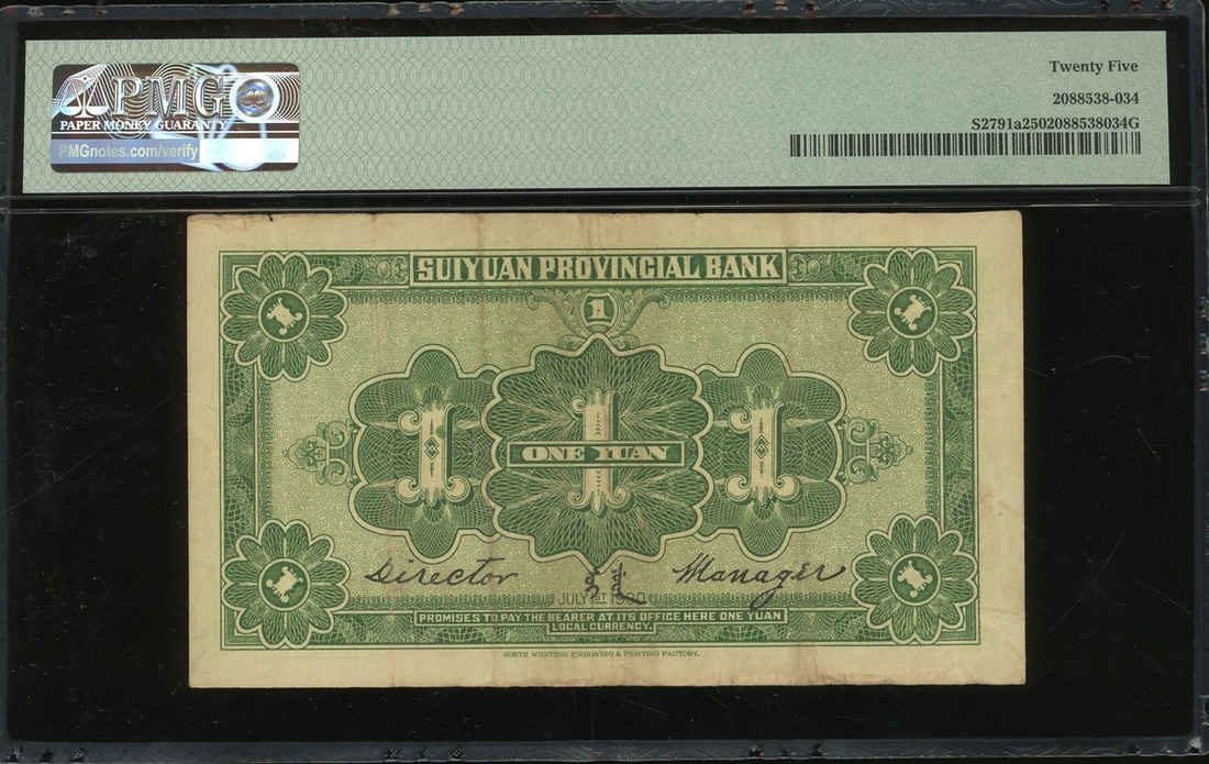 民國十九年綏遠平市官錢局兌換券1元,編號C1931206,PMG 25,僅有6枚經PMG評級,此枚為第二高分