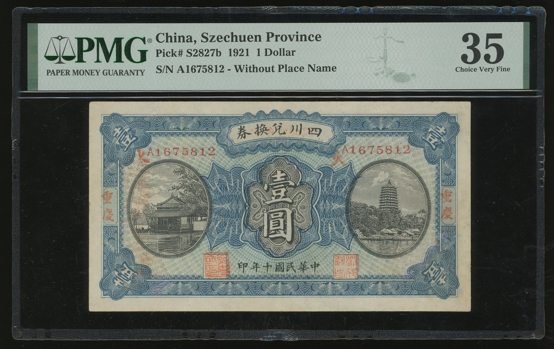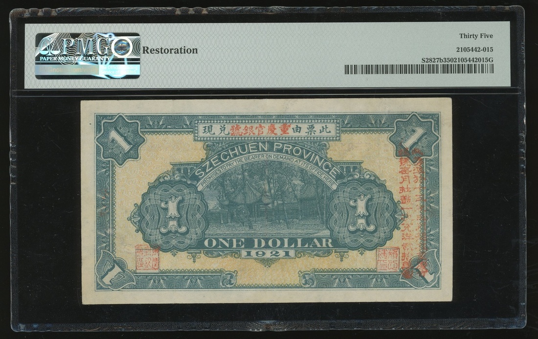 Szechuan Province, $1, Chungking, Year 10(1921), serial number A1675812, (Pick S2827b), PMG 35 Choice Very Fine (Restoration)