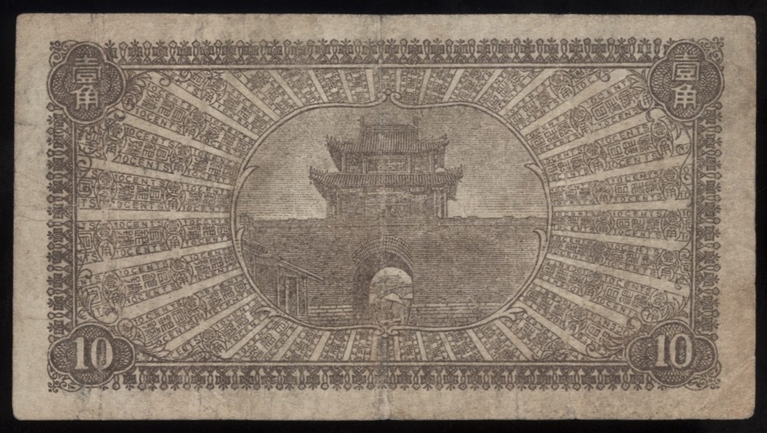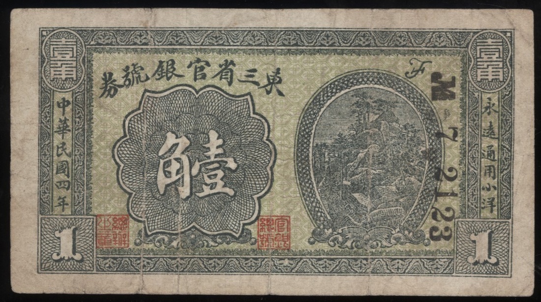 1 chiao, 1915, serial number 72123, dark green, reverse brown, city gate at centre,