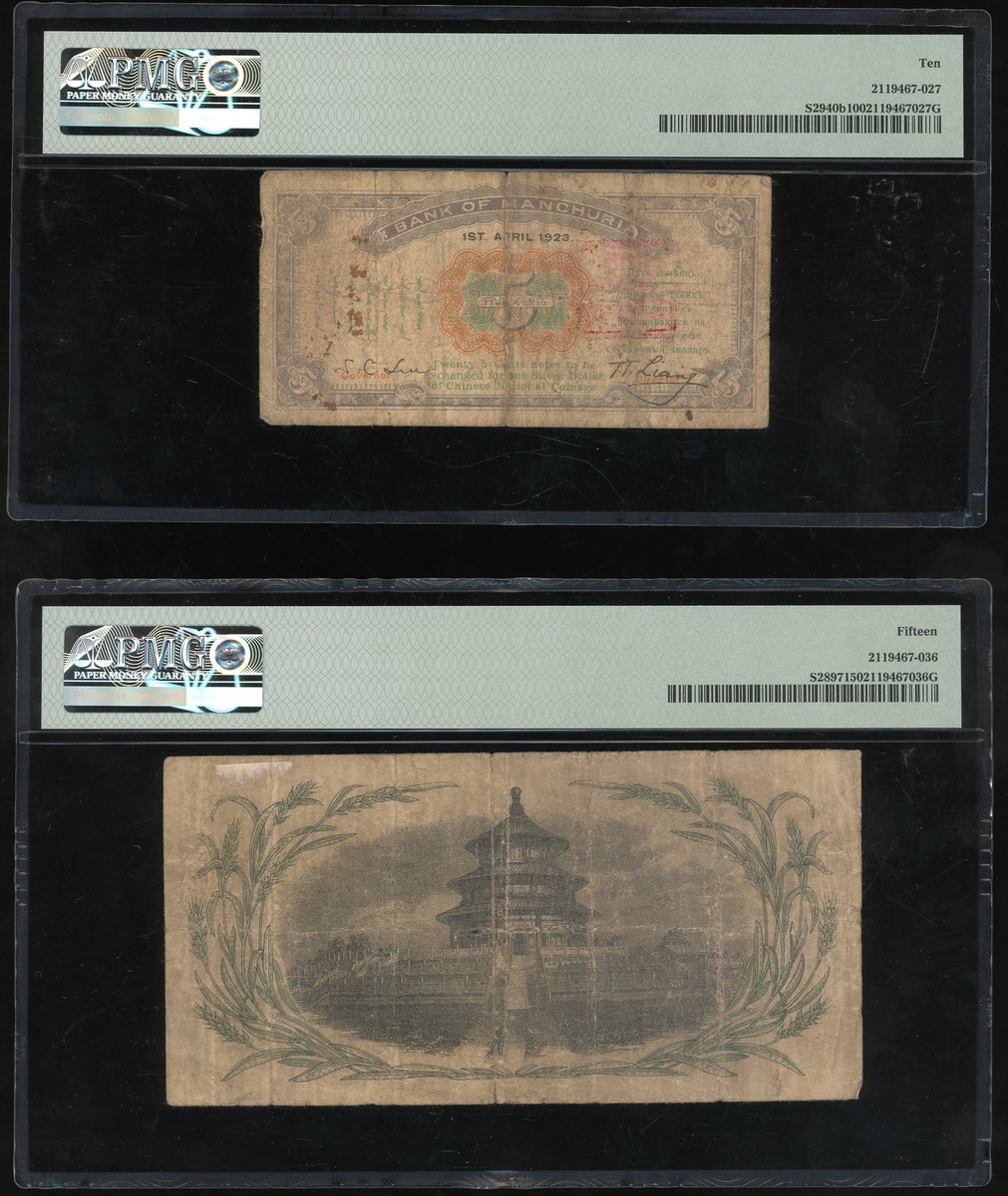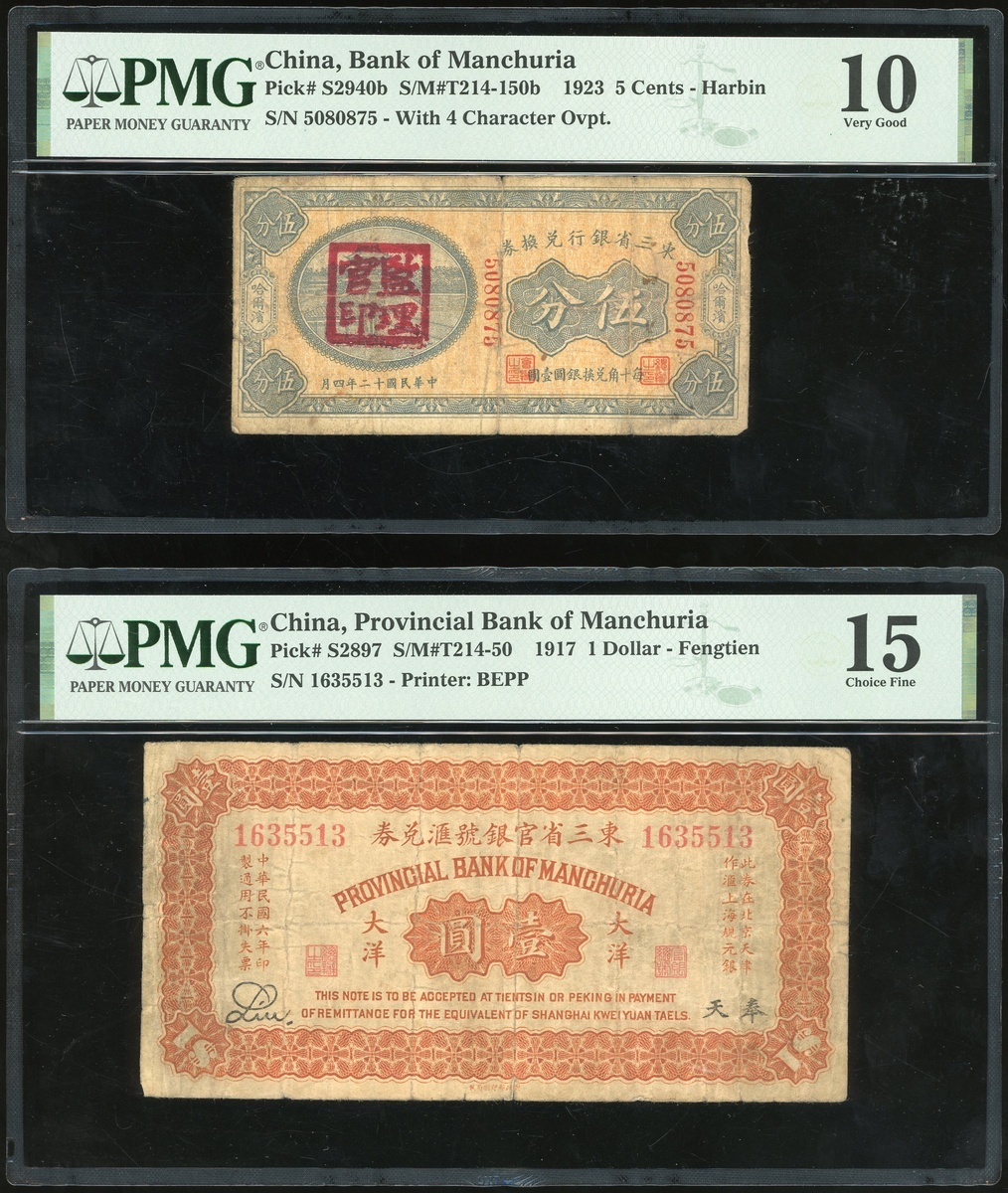 Provincial Bank of Manchuria, a pair of 5 cents, 1923 and $1, 1917, serial numbers 5080875 and 1635513 respectively, (Pick S2940b, S2897), PMG 10 and 15 respectively.(2)
