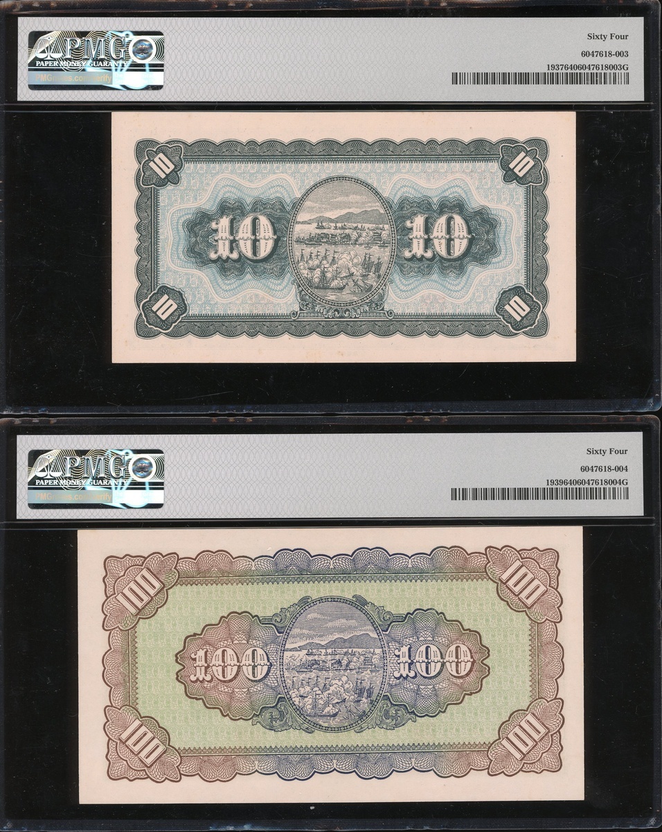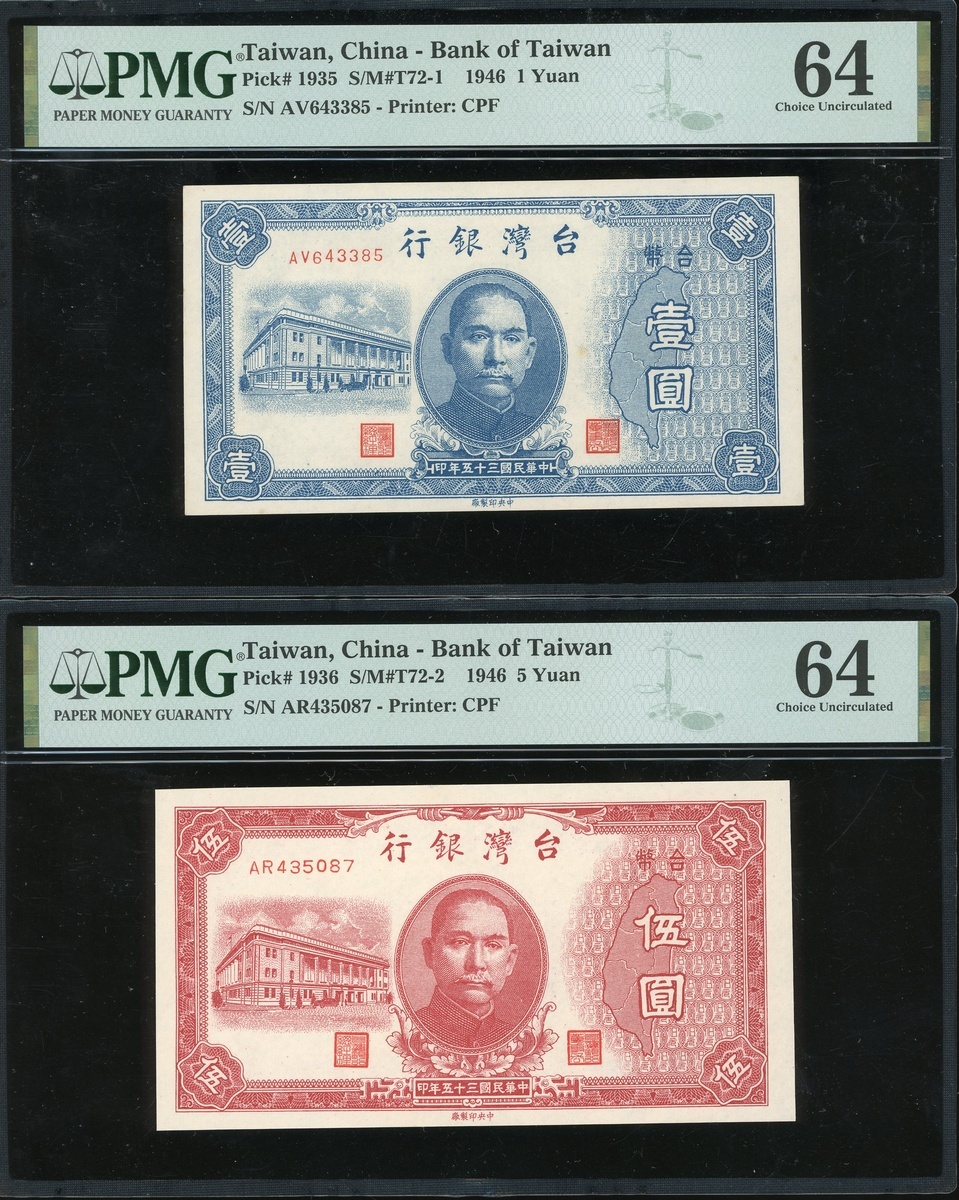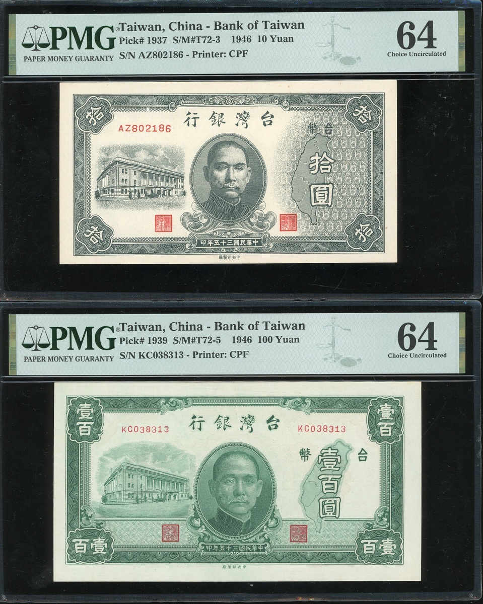 Bank of Taiwan, a group of 4 notes, consists of 1 yuan, 5 yuan, 10 yuan and 100 yuan, Year 35(1946), serial numbers AV643385, AR435087, AZ802186 and KC038313, (Pick 1935, 1936, 1937 and 1939), all graded PMG 64 Choice Uncirculated (4).