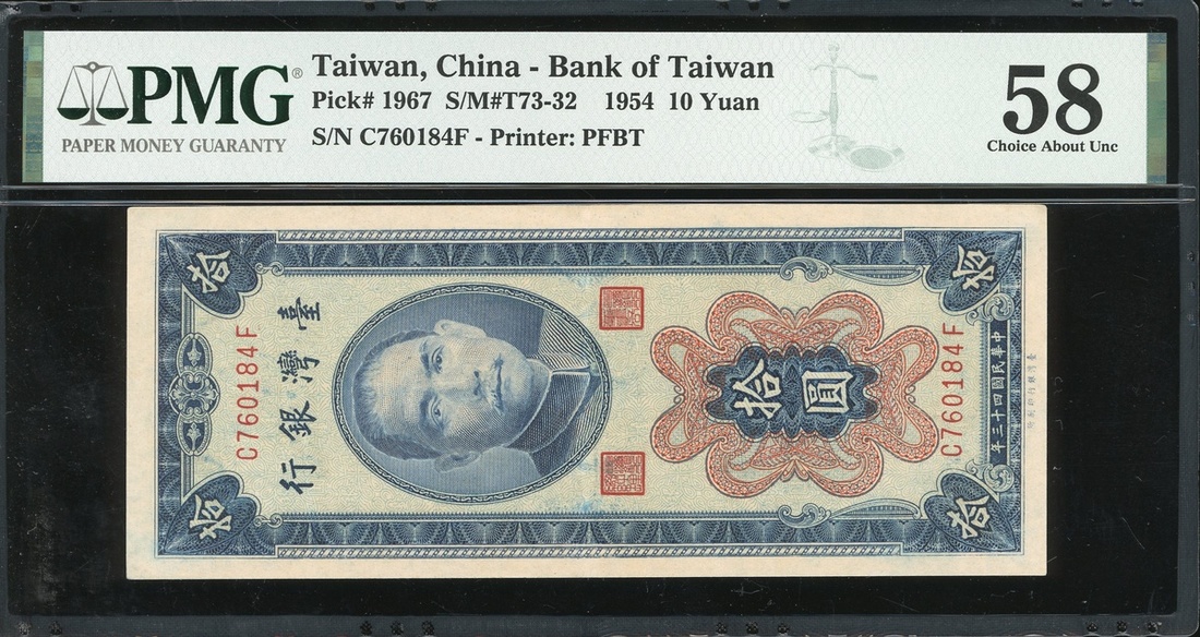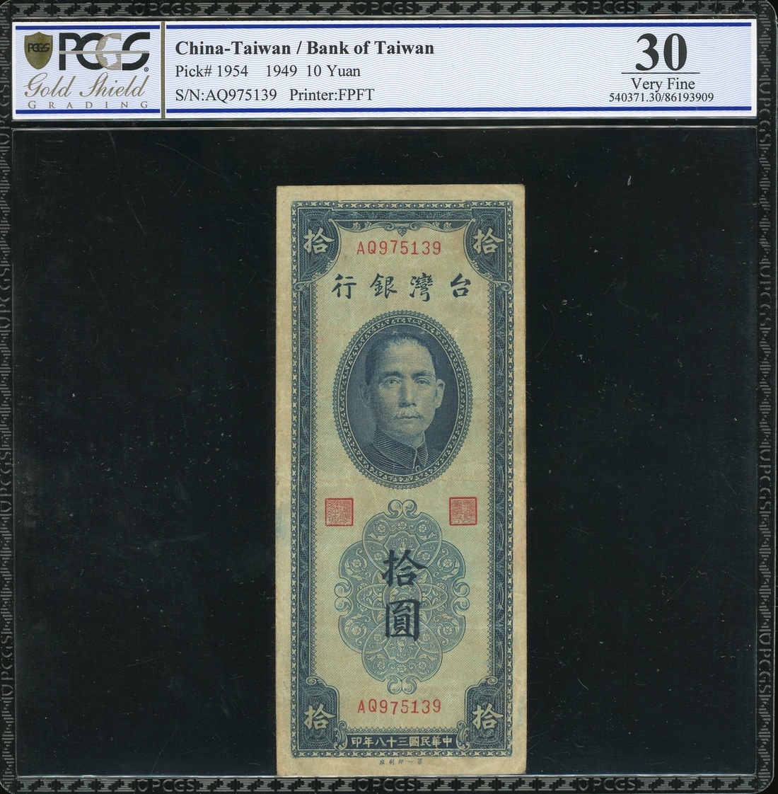 Bank of Taiwan, lot of 2x 10 yuan, 1949 #AQ975139 and 1954 #C760184F, (Pick 1954 and 1967), PCGS Gold Shield Grading 30 Very Fine and 58 Choice About Uncirculated respectively (2)