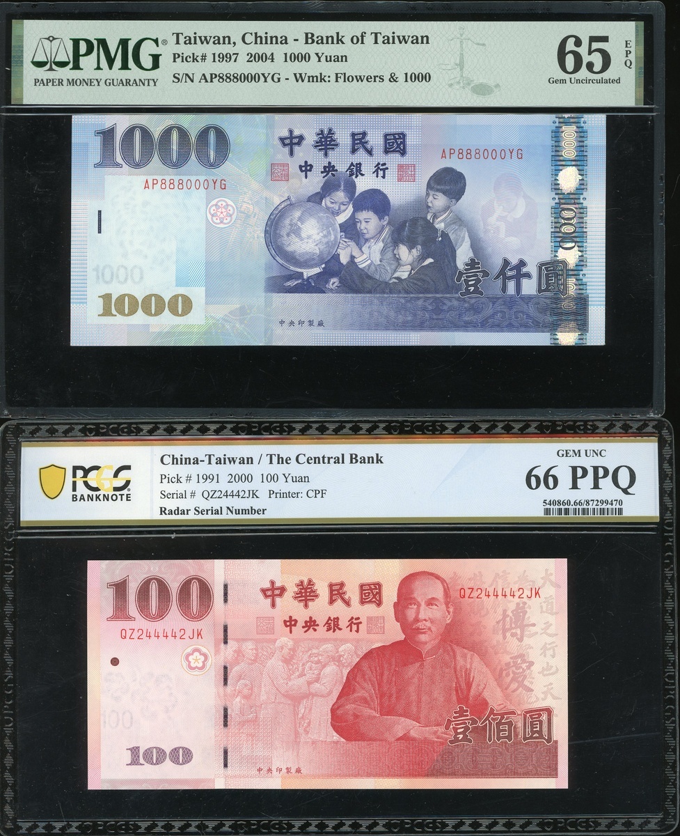 台灣銀行趣味號2枚,包括2000年100元雷達號 QZ244442K ,及2004年1000元AP888000YG,分別PCGS Banknote 66PPQ及PMG 65EPQ