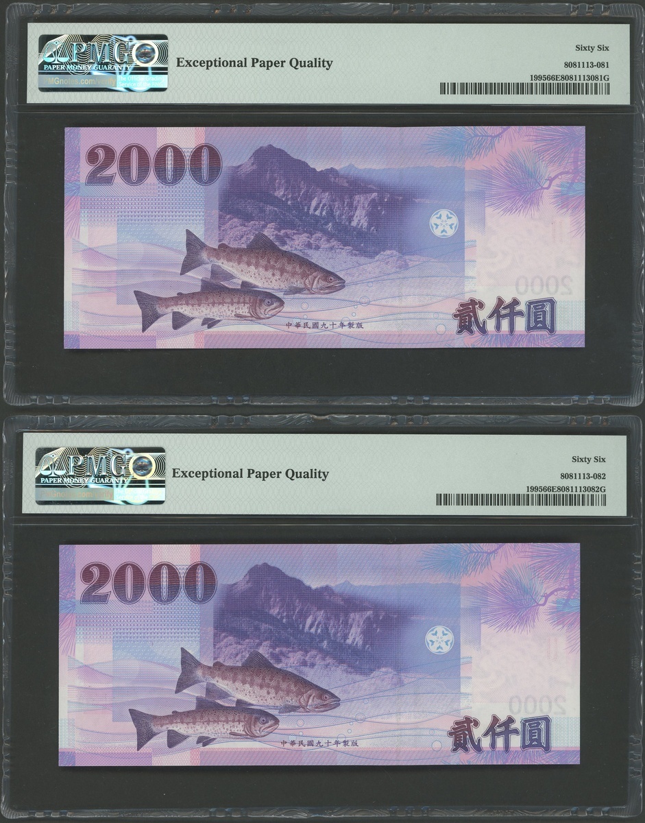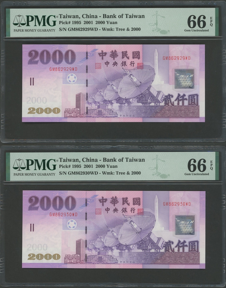 Bank of Taiwan, a pair of 2000 yuan, Year 90 (2001), consecutive serial numbers GM862929WD, GM862930WD, (Pick 1995), PMG 66EPQ Gem Unciruclated (2)