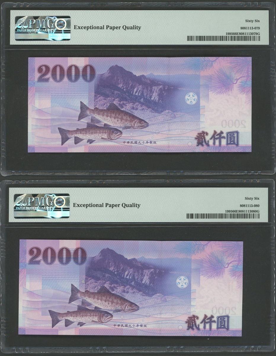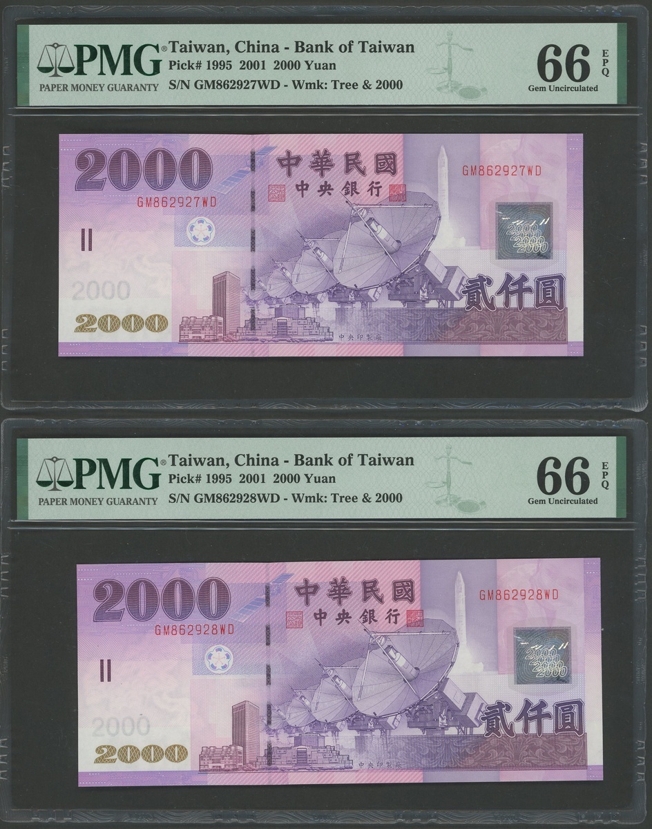 Bank of Taiwan, a pair of 2000 yuan, Year 90 (2001), consecutive serial numbers GM862927WD, GM862928WD, (Pick 1995), PMG 66EPQ Gem Unciruclated (2)