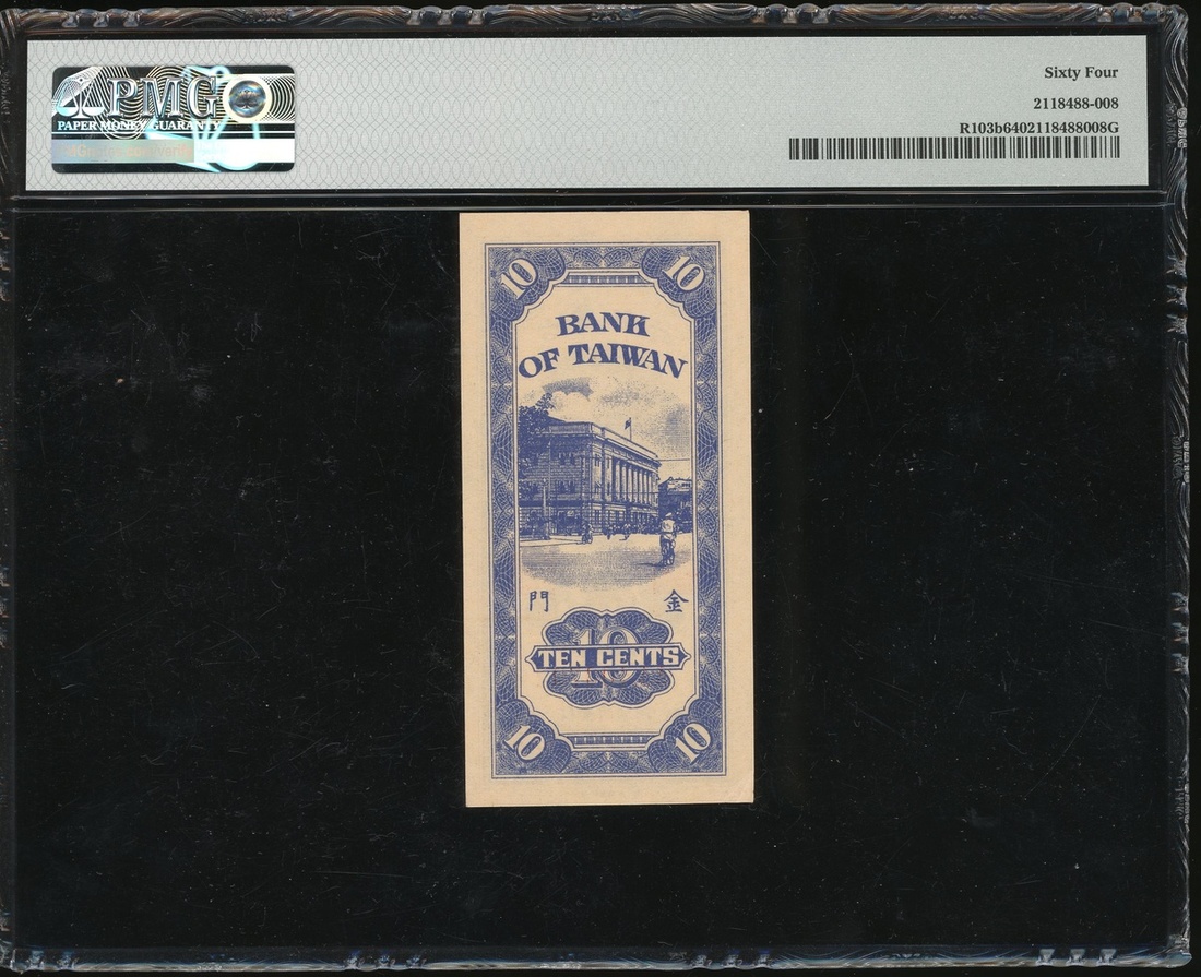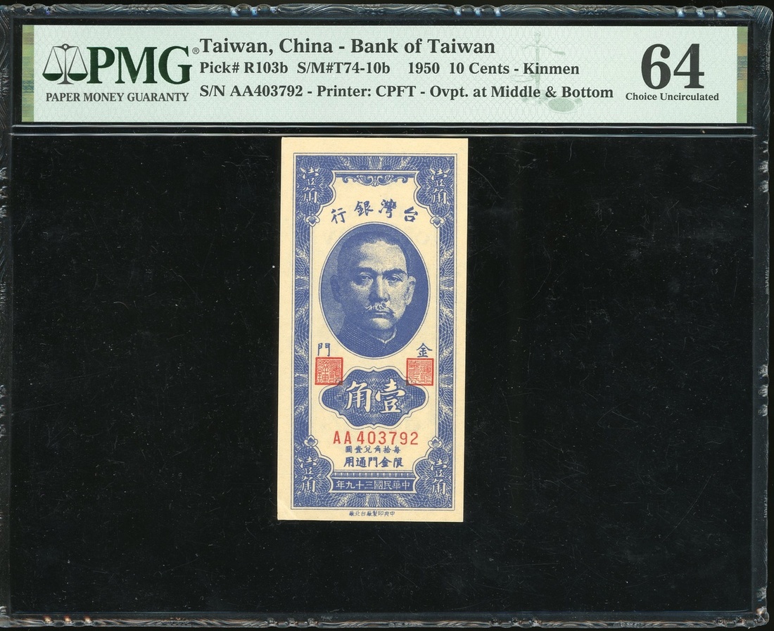 Bank of Taiwan, 10 cents, Kinmen, Year 39 (1950), serial number AA403792, (Pick R103b), PMG 64 Choice Uncirculated