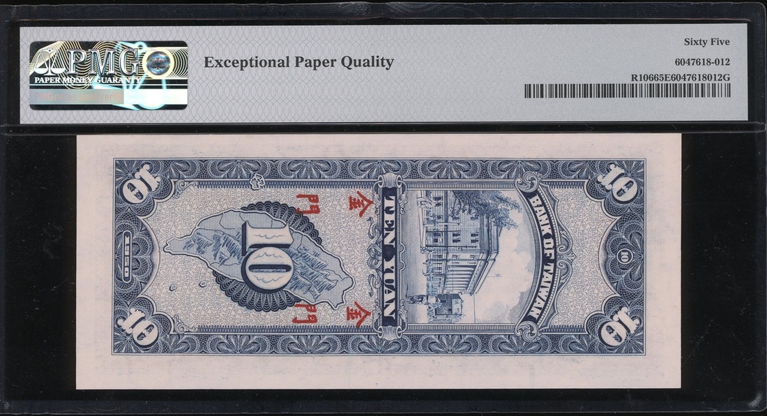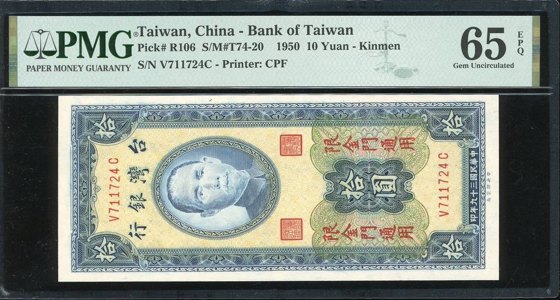 Bank of Taiwan, 10 yuan, Kinmen, Year 39(1950), serial number V711724C, (Pick R106), PMG 65EPQ Gem Uncirculated, rare.