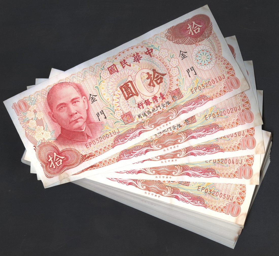 10 Yuan, 1976, Kinmen, pack of 100 consecutive notes, serial numbers EP032001UJ to EP032100UJ, red and multicoloured, Sun Yat-sen at left,