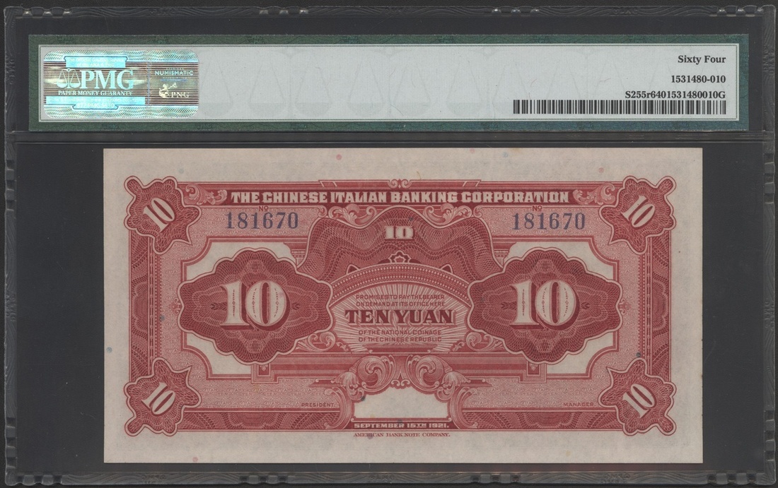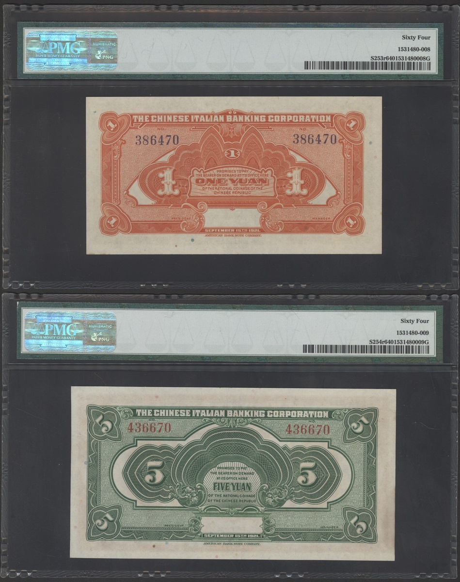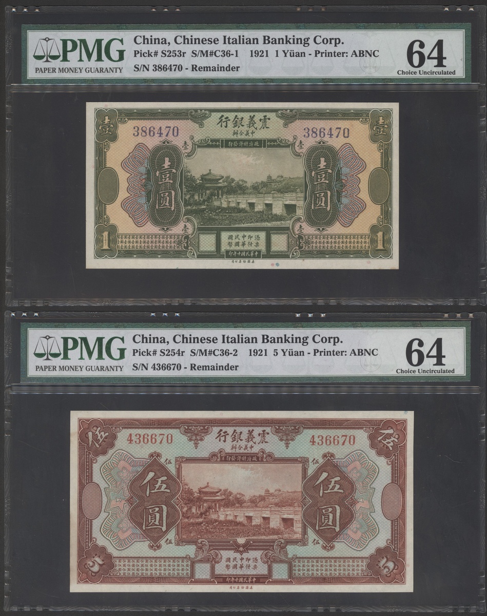 Chinese Italian Banking Corporation, a group of 3 remainders, 1, 5 and 10 yuan, 1921, serial number 386470, 436670 and 181670, (Pick S253r, S254r and S255r), all graded PMG 64 Choice Uncirculated (3)
