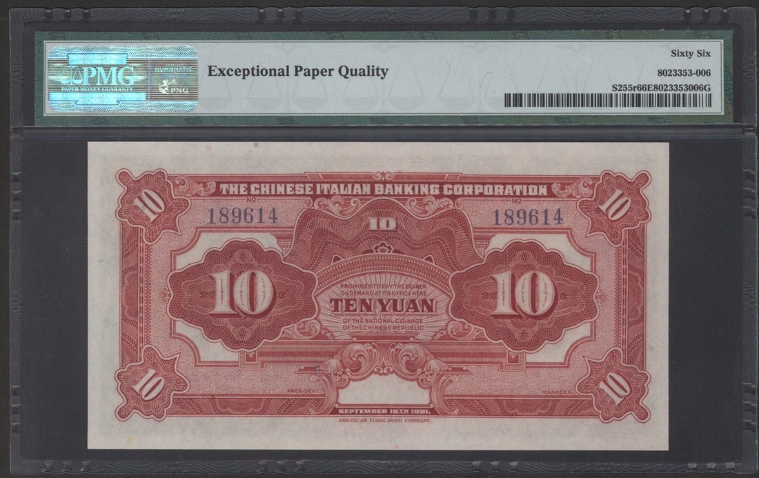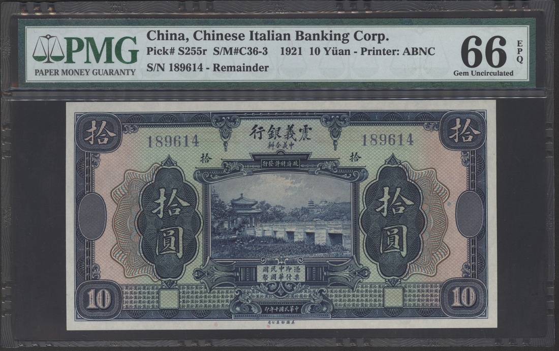 Chinese Italian Banking Corporation, 10 Yuan, 1921, serial number 189614, blue, pavilion at centre, reverse red, remainder, (Pick S255r), PMG 66EPQ Gem Uncirculated