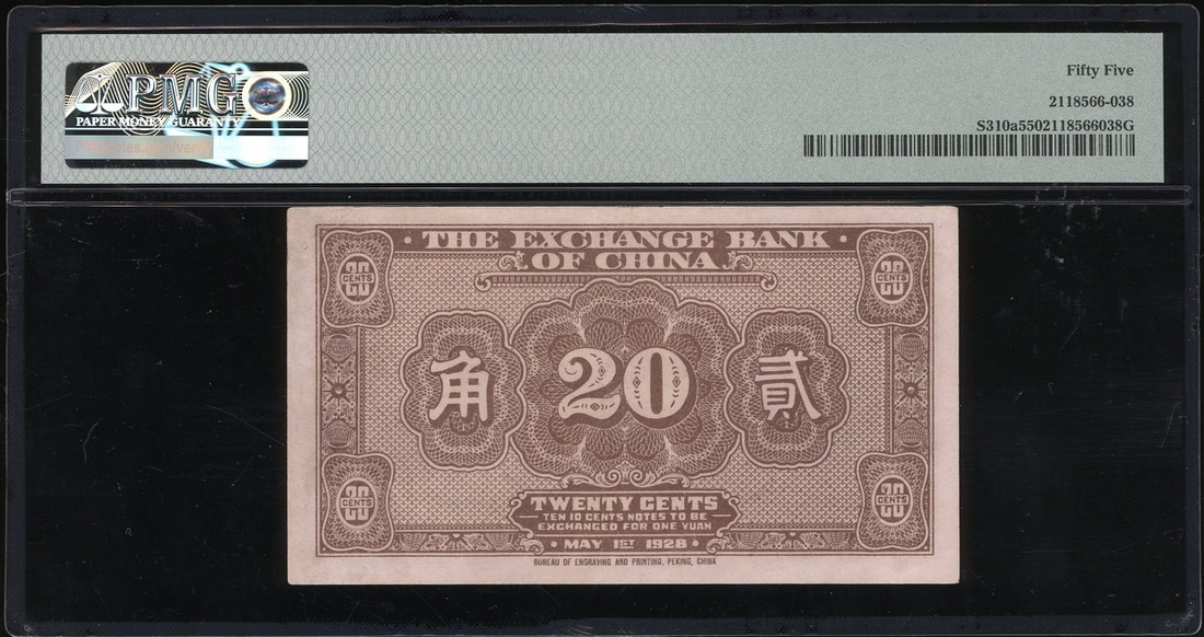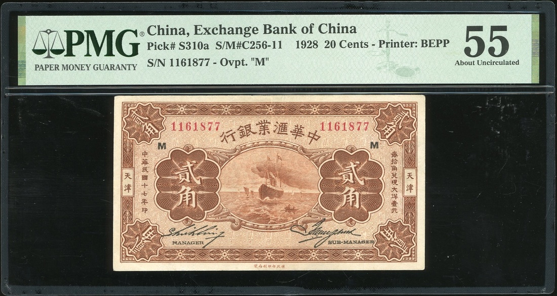 Exchange Bank of China, 20 cents, Tientsin, 1928, serial number 1161877, (Pick S310a), PMG 55 About Uncirculated, only 8 of such notes graded higher in the PMG population report