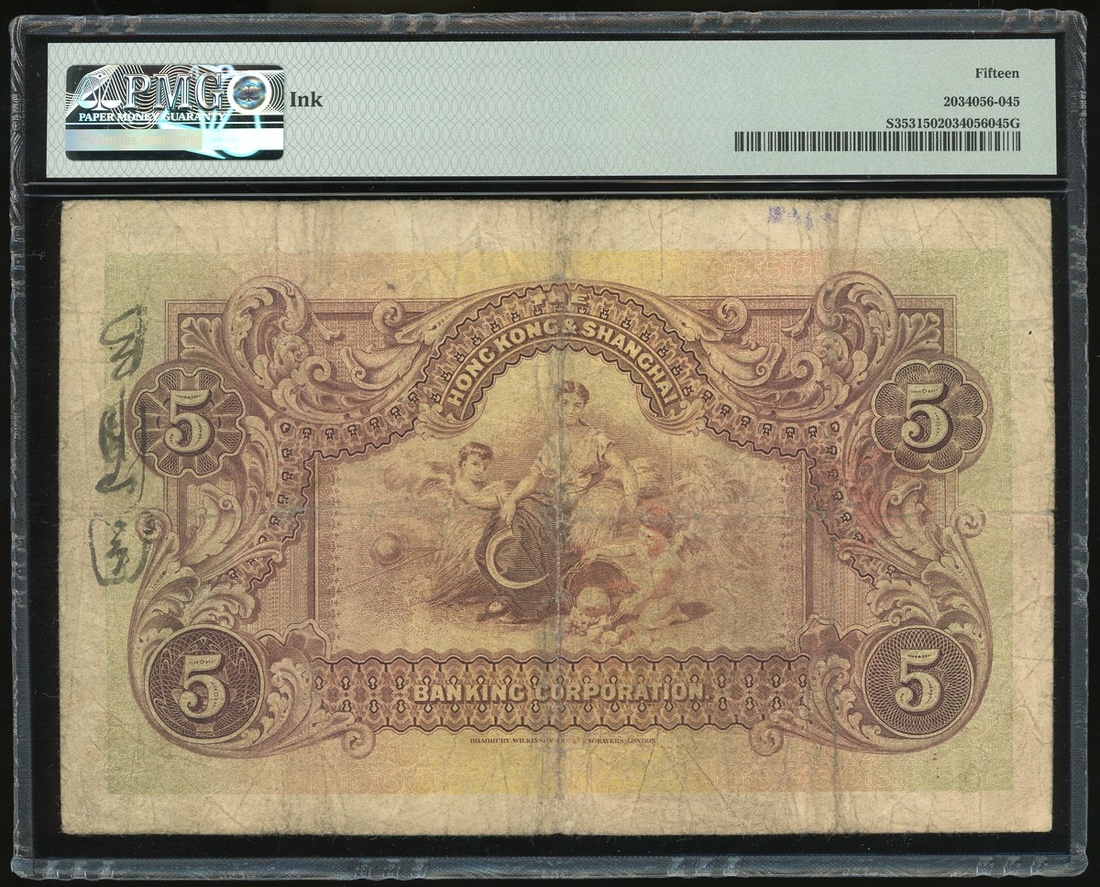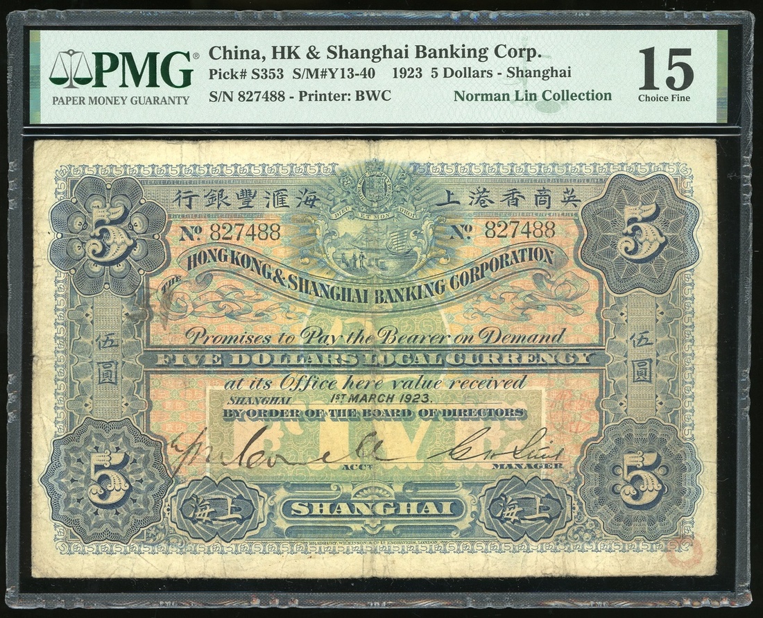 The Hongkong & Shanghai Banking Corporation, 5 Dollars, 1.3.1923, Shanghai, serial number 827488, dark blue and multicoloured, reverse maroon, cherubs at centre, (Pick S353), PMG 15 Choice Fine (Ink)