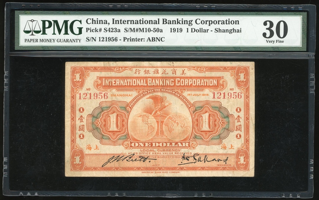 International Banking Corporation, 1 Dollar, 1919, Shanghai, serial number 121956, orange and multicoloured, eagle on globe at centre, reverse green, (Pick S423a), PMG 30 Very Fine