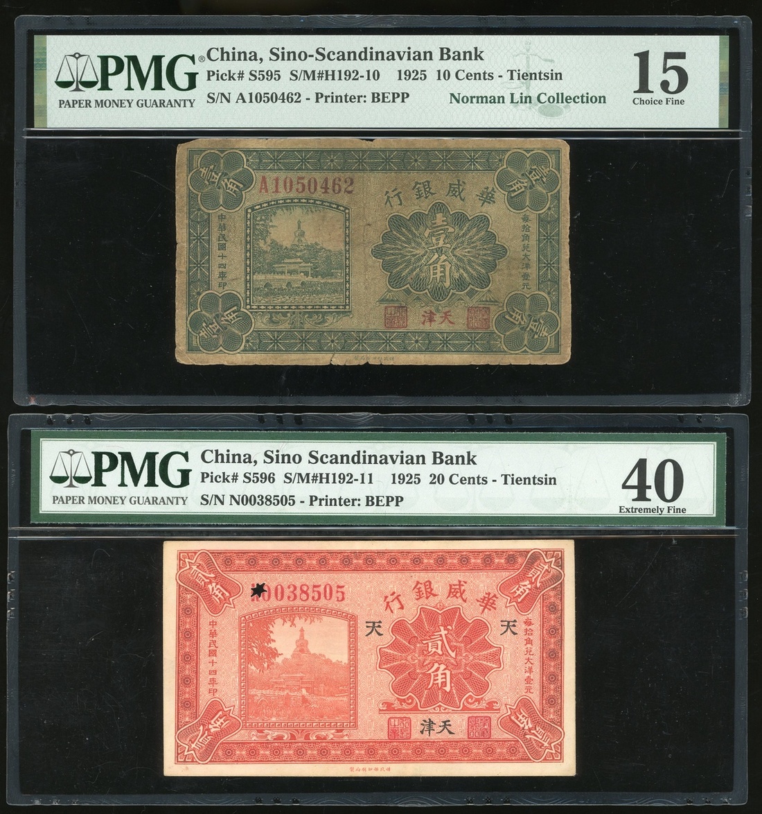 民國十四年華威銀行壹、貳角一組兩枚,天津地名,編號A1050462及N0038505,均PMG 15-40,第二枚打孔註銷,微褪色