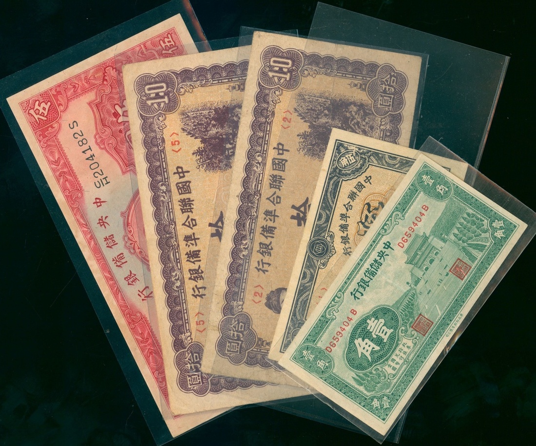 中國偽政府紙幣一組五枚,包括民國二十九年中央儲備銀行壹角、伍圓,中國聯合準備銀行伍角、拾圓,GVF-AU