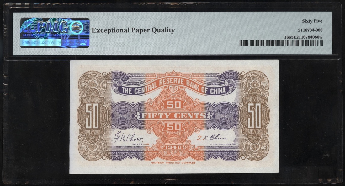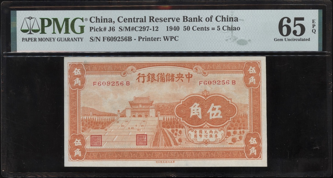 民國二十九年中央儲備銀行伍角,編號F609256B,PMG 65EPQ